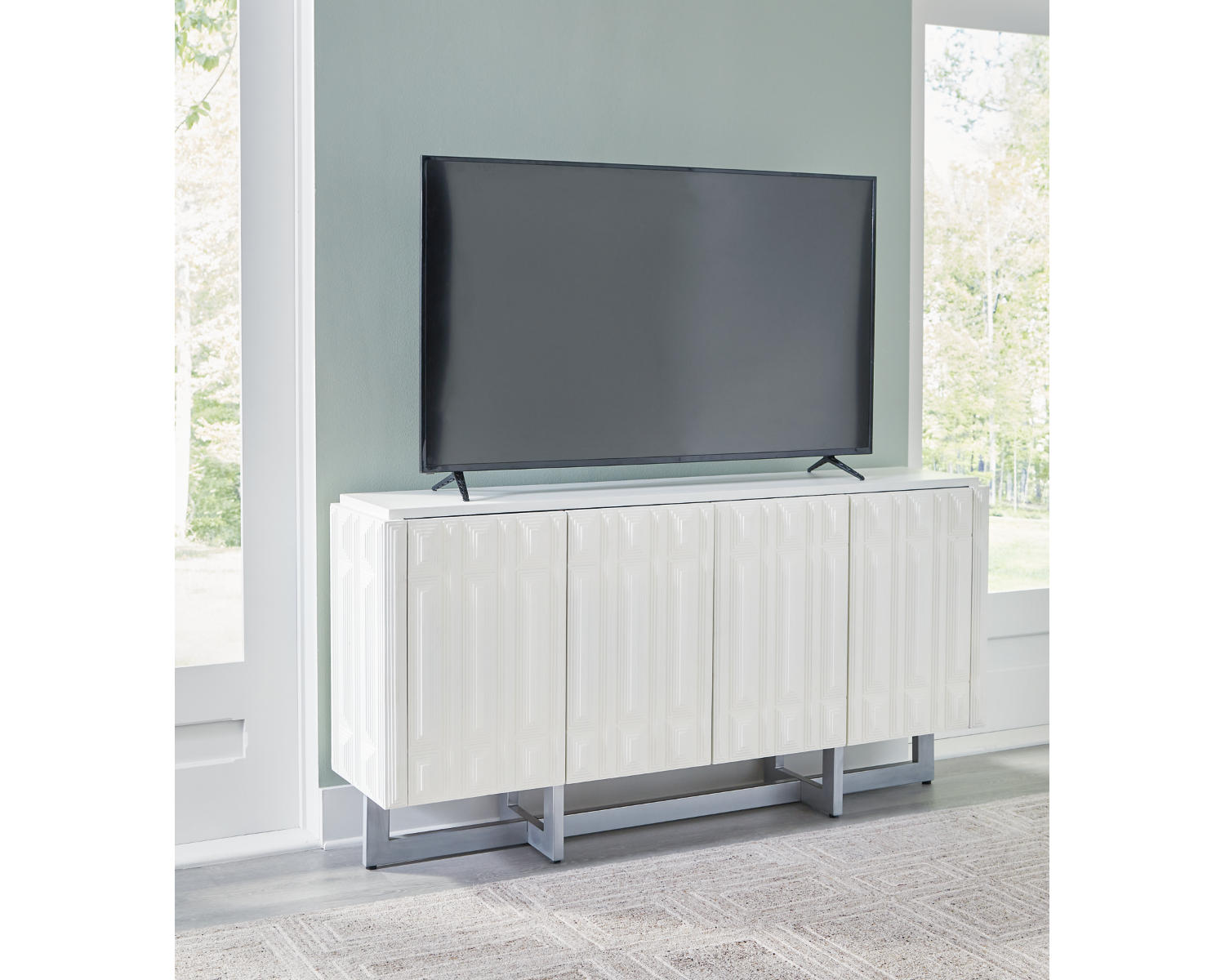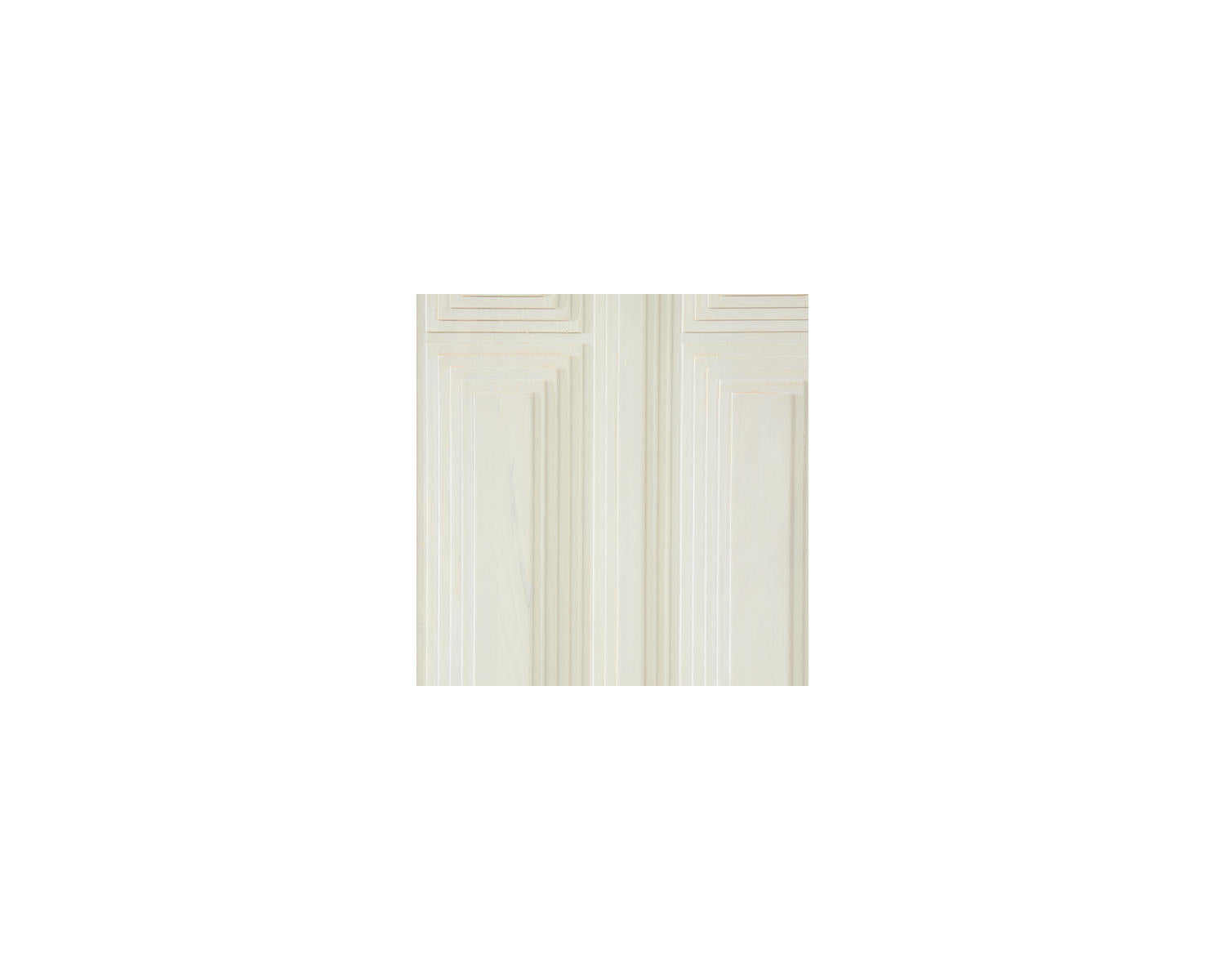 Accent cabinet. Constructed of solid wood in a lightly distressed white finish. Subtle sand blast effect to enhance the wood grain. Step pattern door fronts. 4 doors and 2 shelves. Push magnet door function. Pewter finished metal base. Openings in back for electronics.
