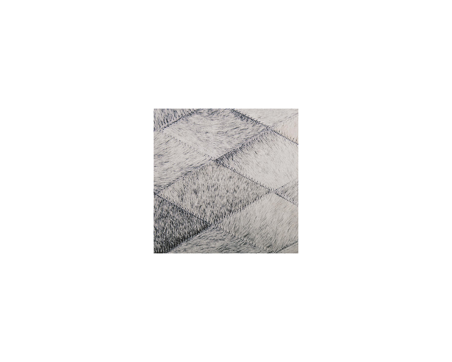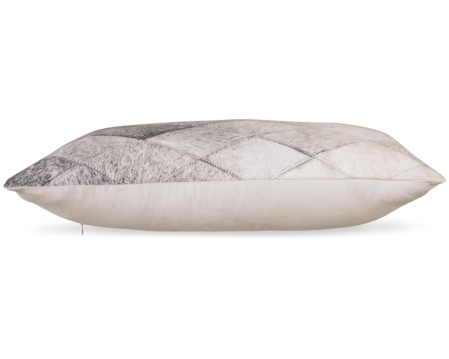 Faux hair on hide diamond design in shades of gray and brown. Solid reverse in gray. Knife edge construction. Polyester cover. Zipper closure. Fiber filled. Machine washable cover.