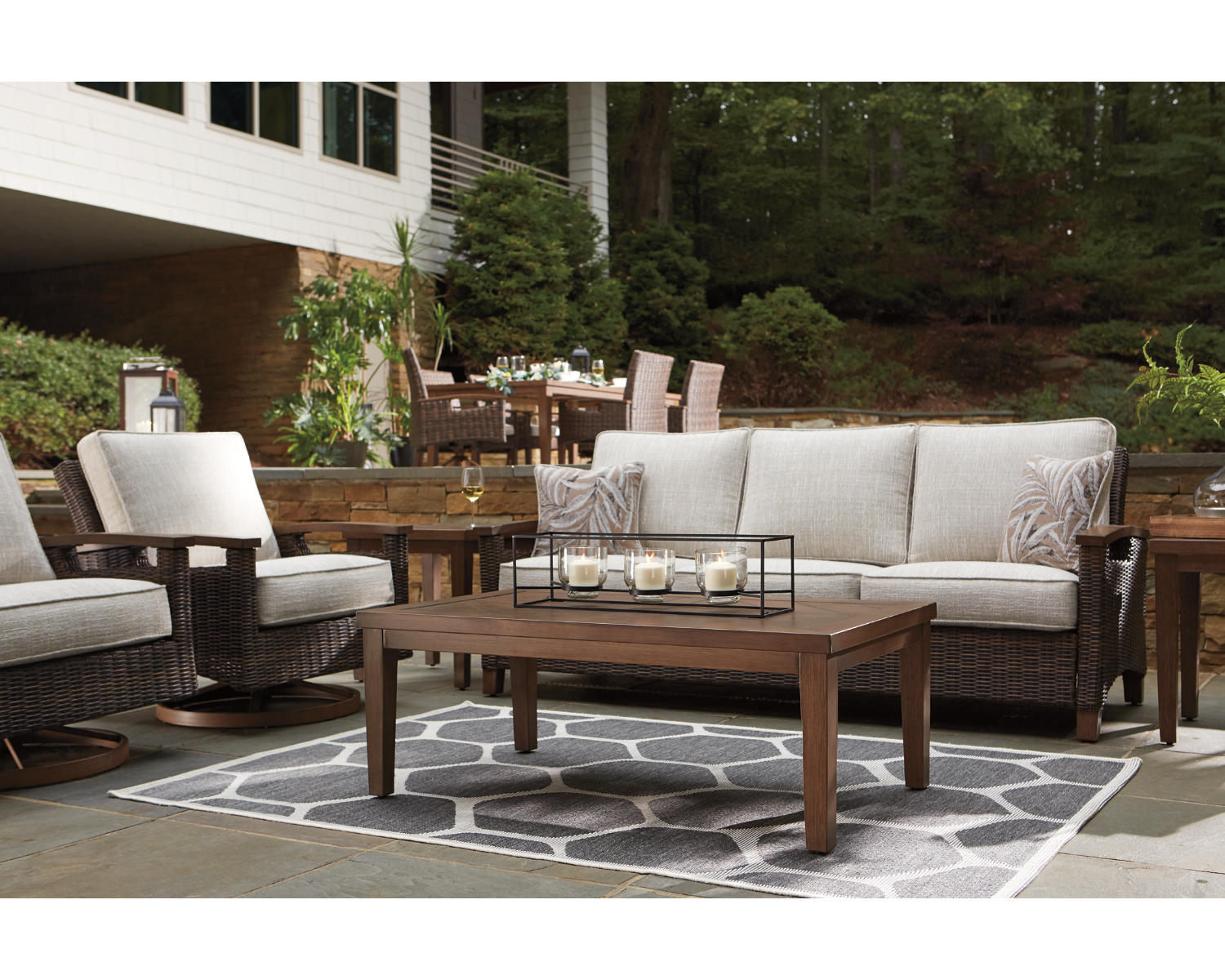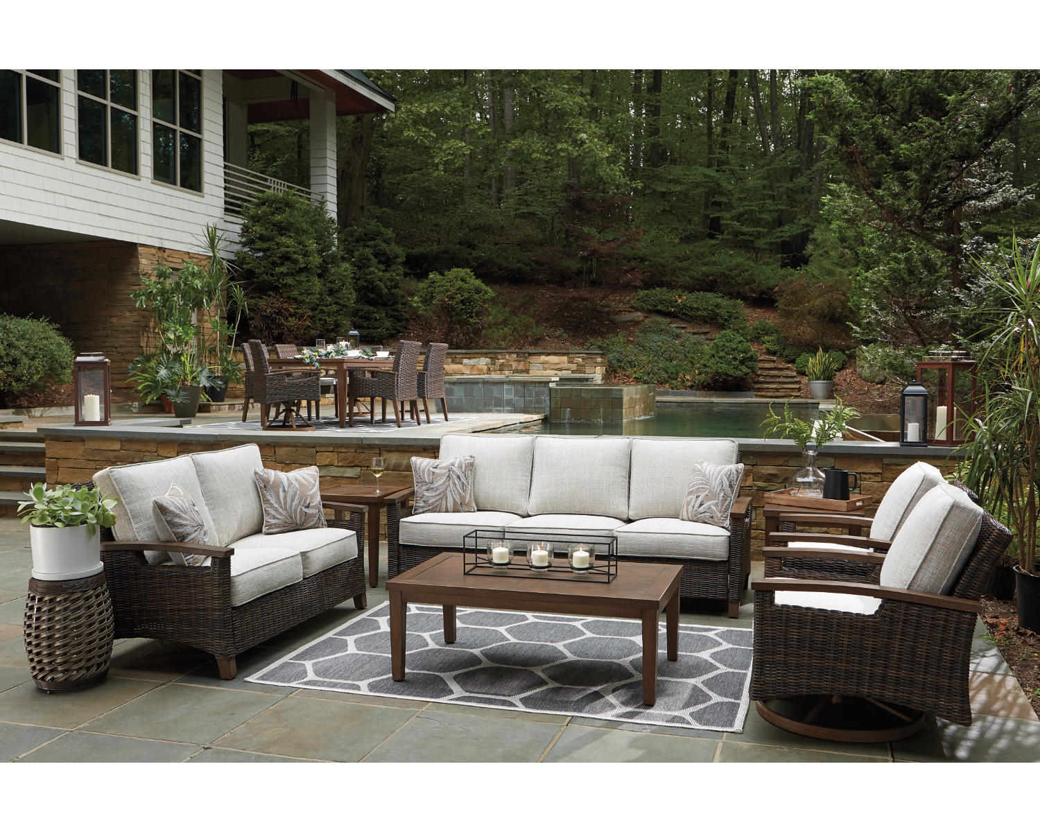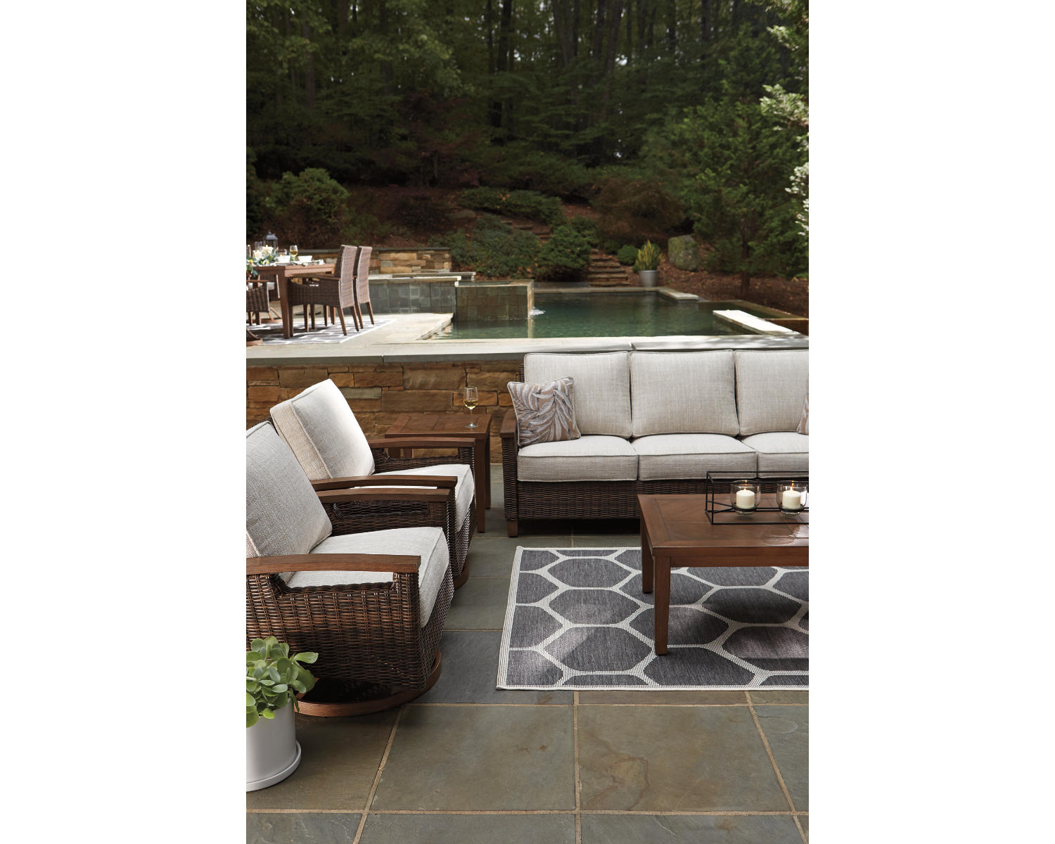 Collection has hand woven resin wicker with rust free aluminum frames with a brown wood-look finish. All cushions and throw pillows are made with Nuvella high performance fabric. Choose from dining, bar table and seating sets. For dining, choose from stationary dining chair or swivel rocker dining chair. 56" square bar table includes 55,000 BTU CSA approved stainless steel burner, enclosed storage area with shelves. Stools have fast dry foam seats below the woven resin wicker to provide comfort. No seat pads needed for barstools. To order a 9-piece bar table set, order P750-130(4) and P750- 665. Assembly required for all skus.