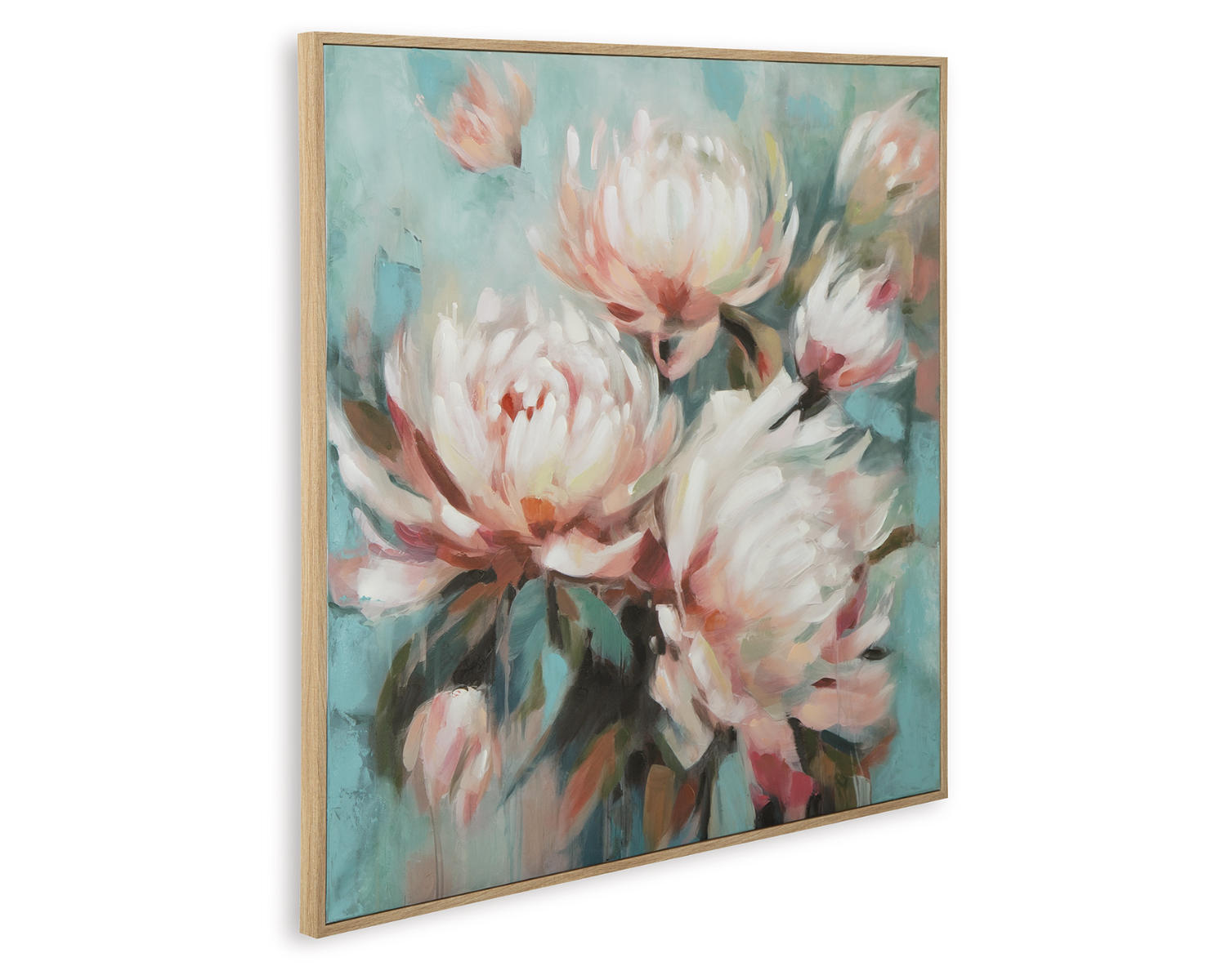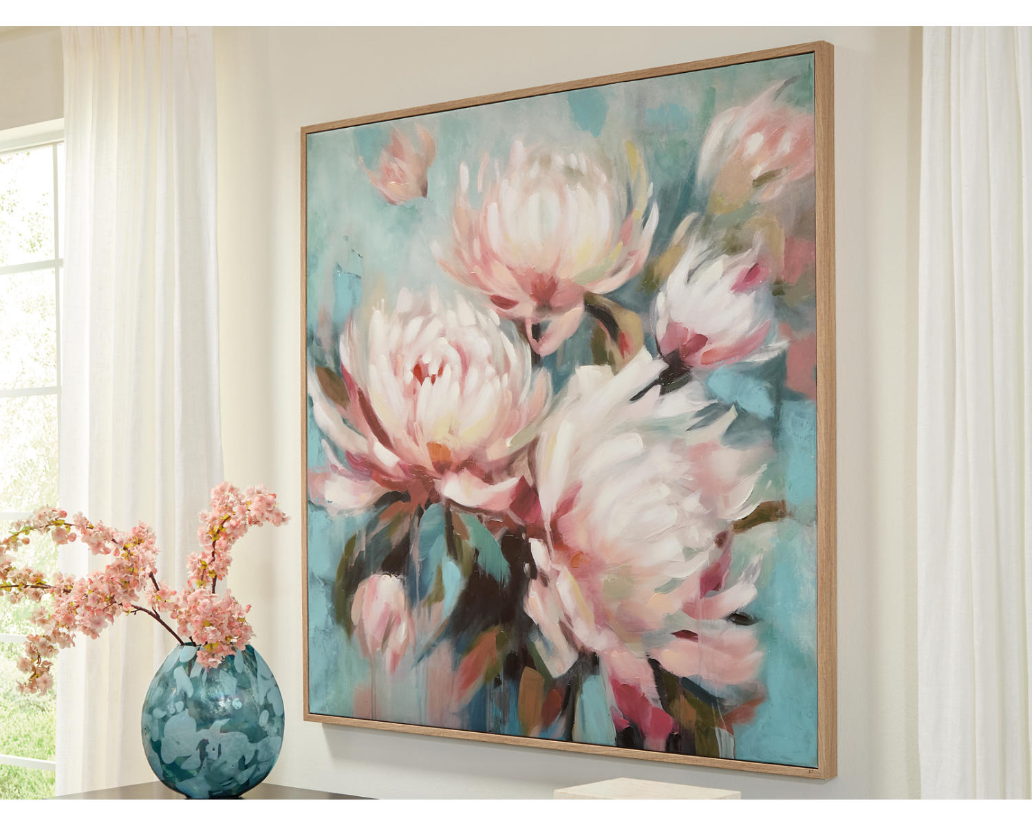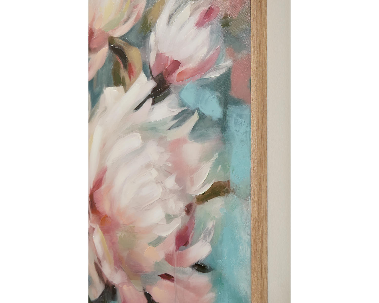 Style is blooming in this wall art. Graceful in presence, its pink florals dance across an aqua blue background—making it perfect for adding a touch of soft serenity to a bedroom or living room. And this detailed design is hand-painted, making each piece of artwork uniquely beautiful.