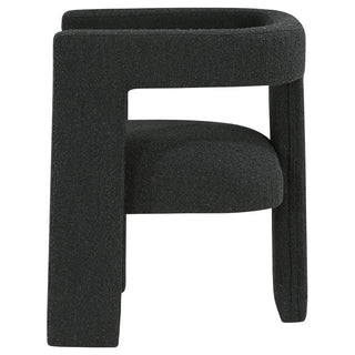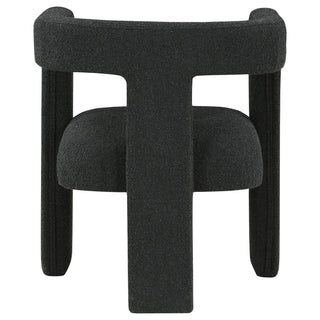 Enveloped entirely in the embrace of plush bouclé, this chair redefines the art of relaxation with its all-fabric design. The seamless transition from the cushioned seat to the curved arms, all robed in the same soft fabric, creates a cocoon of comfort. This chair's silhouette is a gentle wave of tranquility, its form an ode to the curves found in nature. The uninterrupted bouclé upholstery invites a serene tactile experience, transforming the chair into a modern sanctuary. It's a haven of softness, a singular statement of elegance and ease.