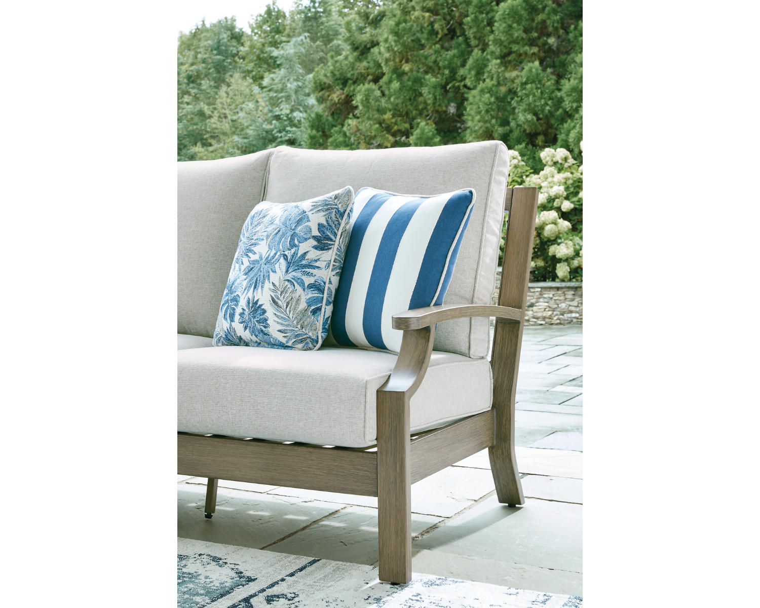 Millennium Collection. Wood-look paint finish on aluminum frame. Nuvella+ high performance beige fabric. Two throw pillows included with loveseat and four throw pillows included with sofa. Sintered stone tile table tops. Assembly required.