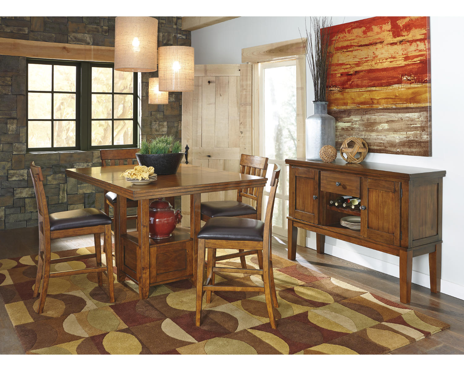 Made with select acacia veneers and hardwood solids. Gently distressed and burnished dark brown finish. D594-35 has a planked table design with thick-look tops and butterfly leaf. Seat covers in brown faux leather. Server features a working drawer along with 2 doors and wine storage. D594-42 table has storage base and removable leaf.