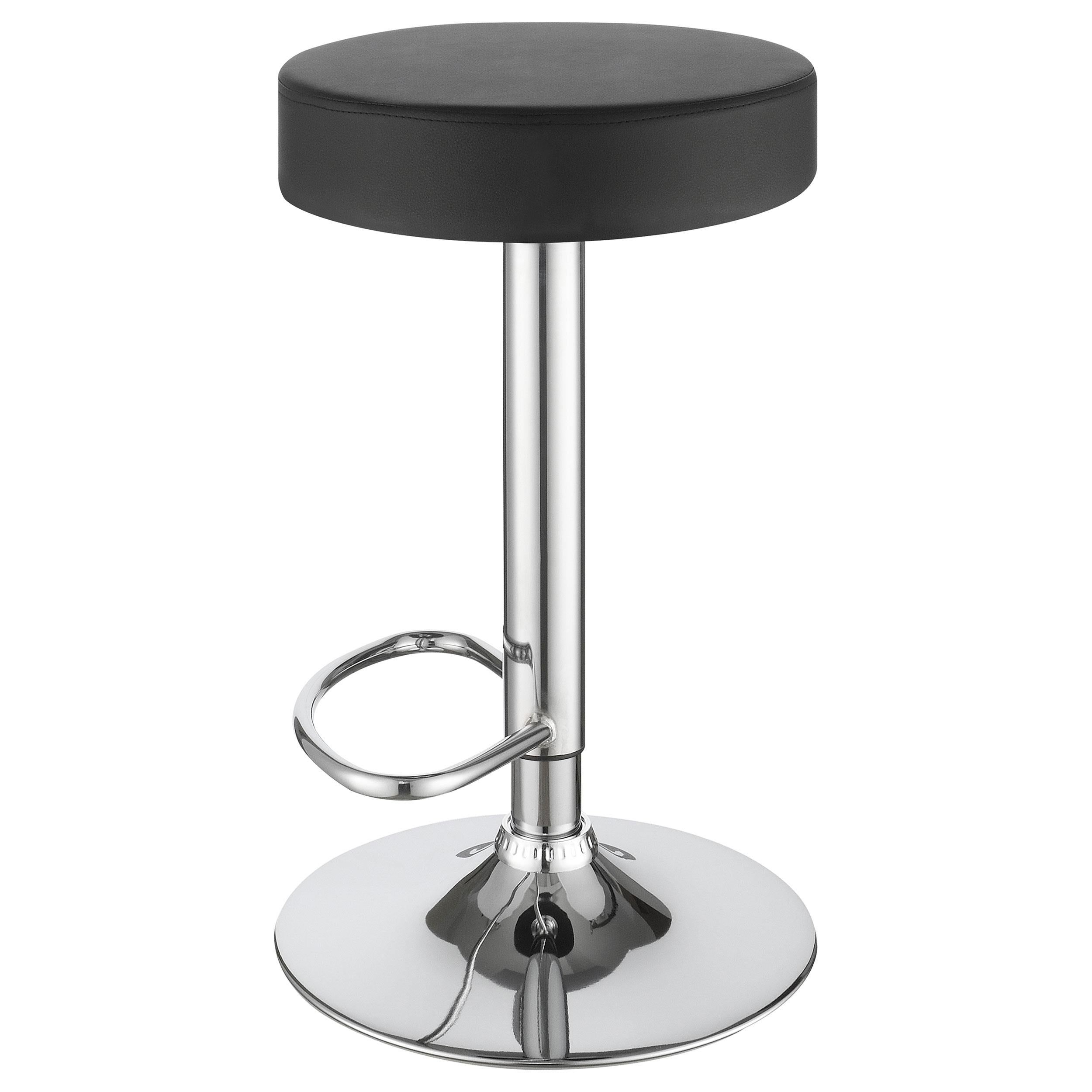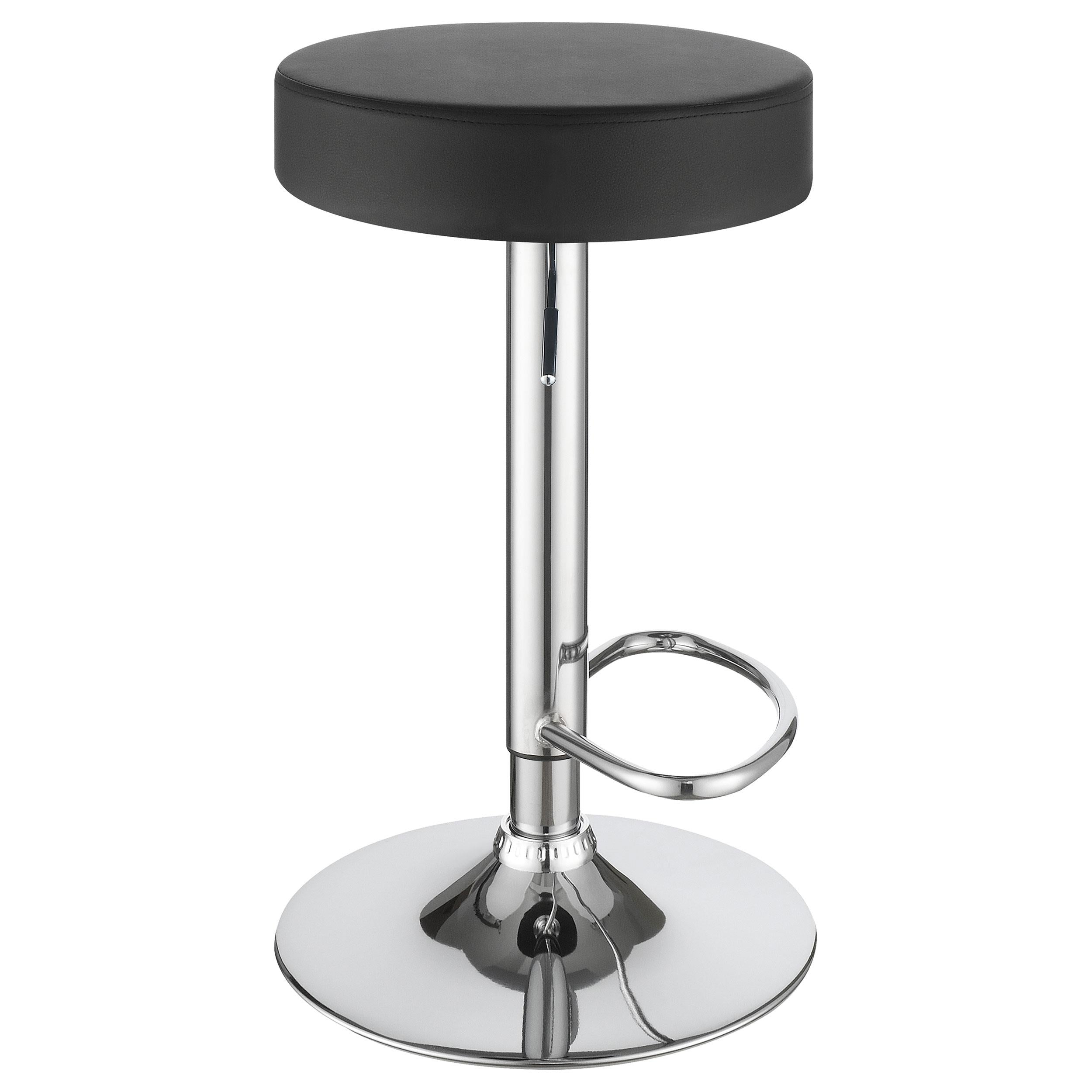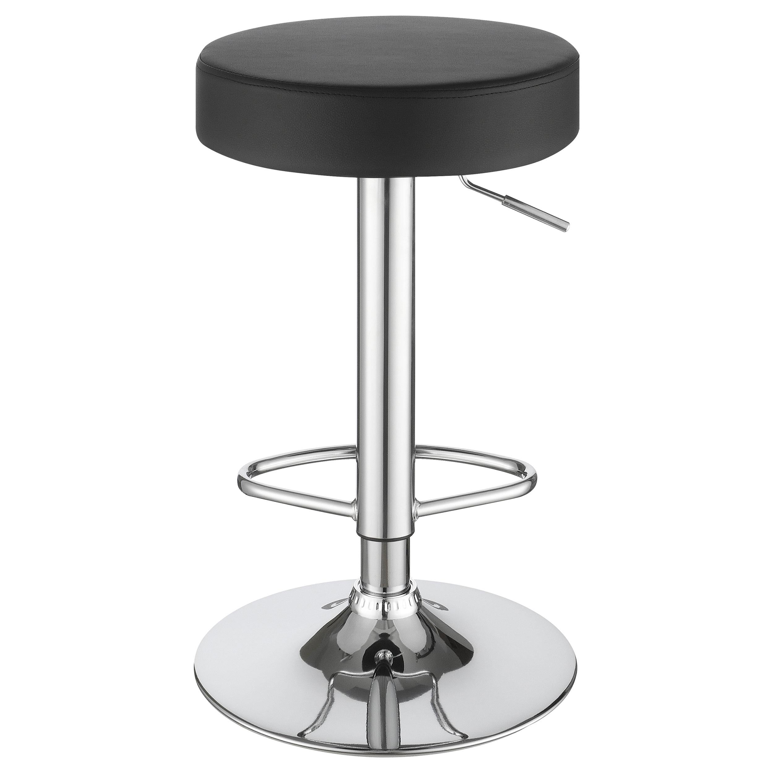 Add a sleek and modern touch to your space with this minimalist adjustable bar stool. Featuring a round, cushioned seat in durable faux leather, it provides comfort and style for any counter or bar area. The hydraulic gas lift mechanism allows for easy height adjustment, ensuring a perfect fit wherever you need it. With a sturdy chrome base and built-in footrest, this stool combines practicality with contemporary flair. Ideal for both home bars and kitchens, it offers a compact and versatile seating solution.