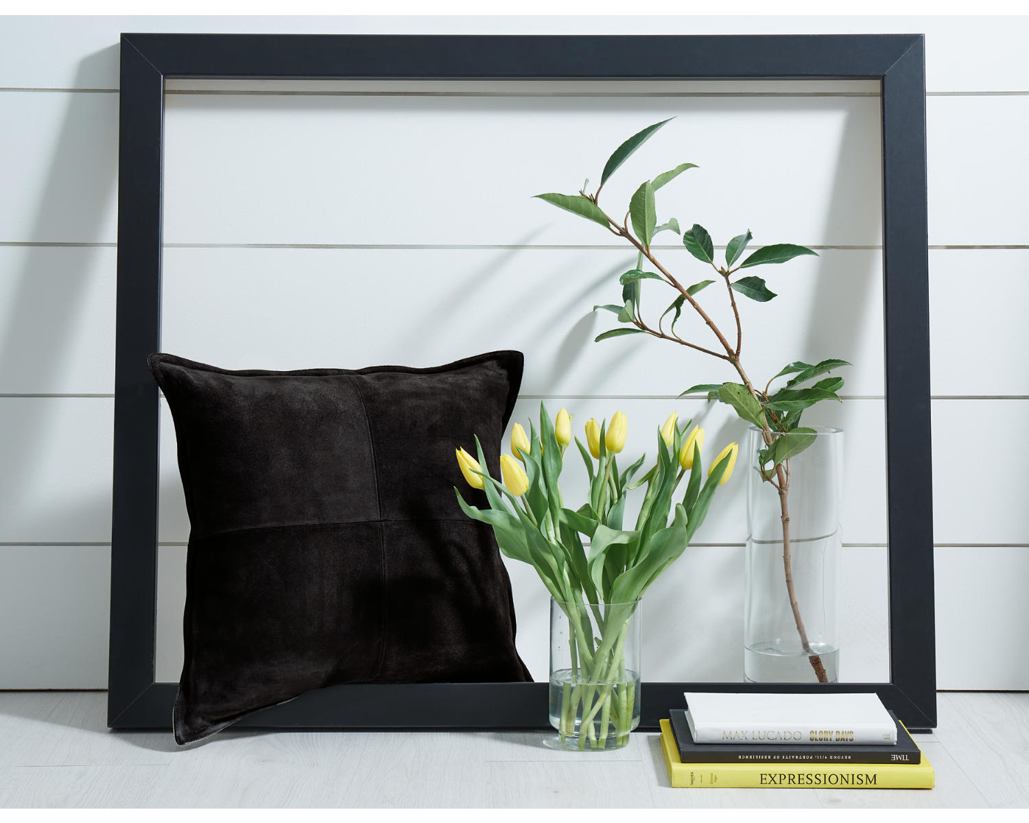 Add casually cool comfort to your couch with this pillow. Its sumptuous suede in a black patchwork pattern with flange is the essence of chic, cozy style.