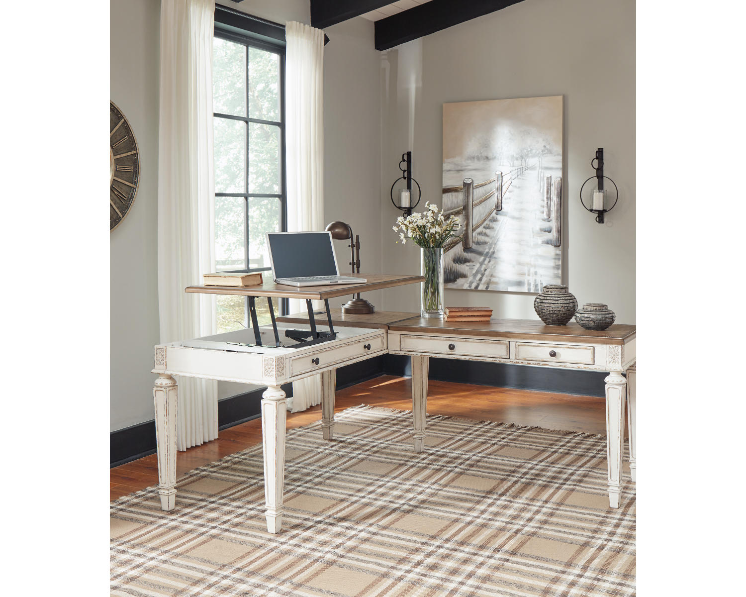 Made with Birch and White Oak veneers with Poplar solids. Two-tone finish featuring chipped white cases with distressed wood tone tops. L-desk configuration. The return can be removed to use the main desk alone. H743-34 and H743-134 desks have an AC power supply with (2) USB charging ports. Return desk features two drawers and cord management. Accent bookshelf has drawer storage and matching two-tone effect. H743-134 desk features an incorporated lift top mechanism for working at a standing position and is compatible with H743-34R.