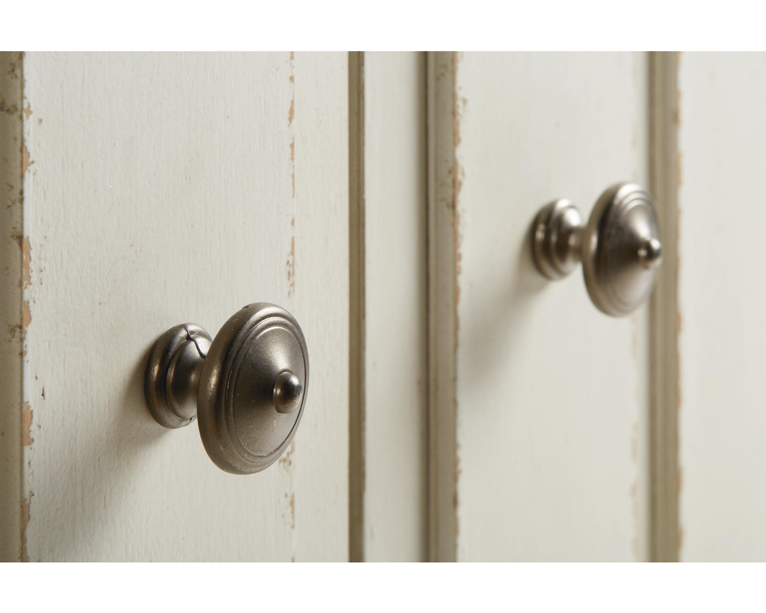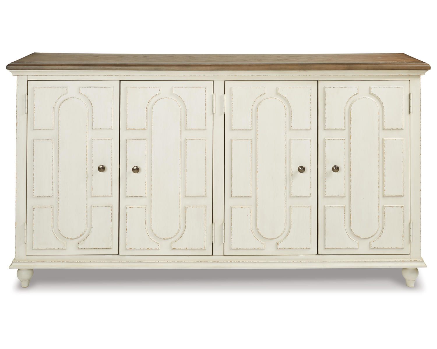 Whether your style is cottage chic, boho inspired or uniquely eclectic, this accent cabinet is sure to look right at home. Standout elements include raised panel door fronts that are a work of art. Wonderfully timeworn in antique white, this 4-door cabinet is topped with a warm brown finish for two-tone interest. Two adjustable shelves add to its practicality.