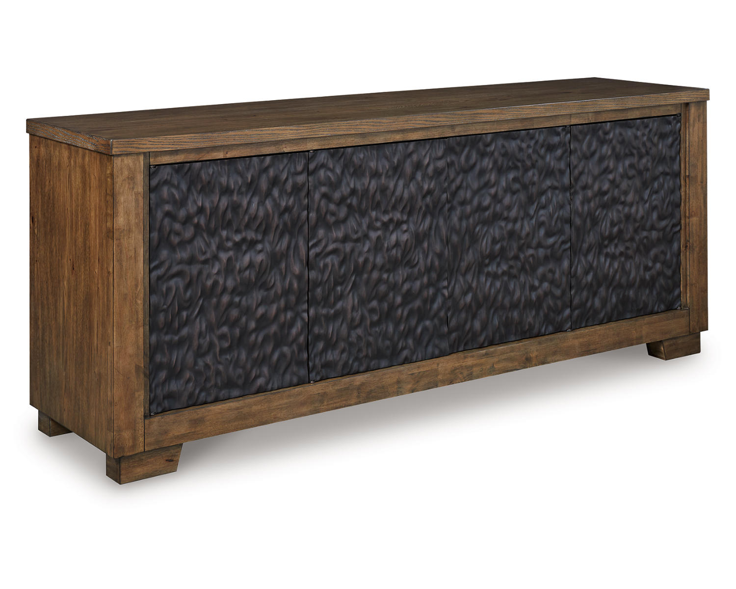 This TV stand is not just furniture—it’s a work of art. The cabinet door design is nothing short of a masterpiece. Its deep tribal texture and two-tone finish convey an intentional hand-carved feel creating a unique and attractive surface. Boasting an abundance of storage space and cord management, the large-scale silhouette accommodates flat screen TV’s up to 85 inches.