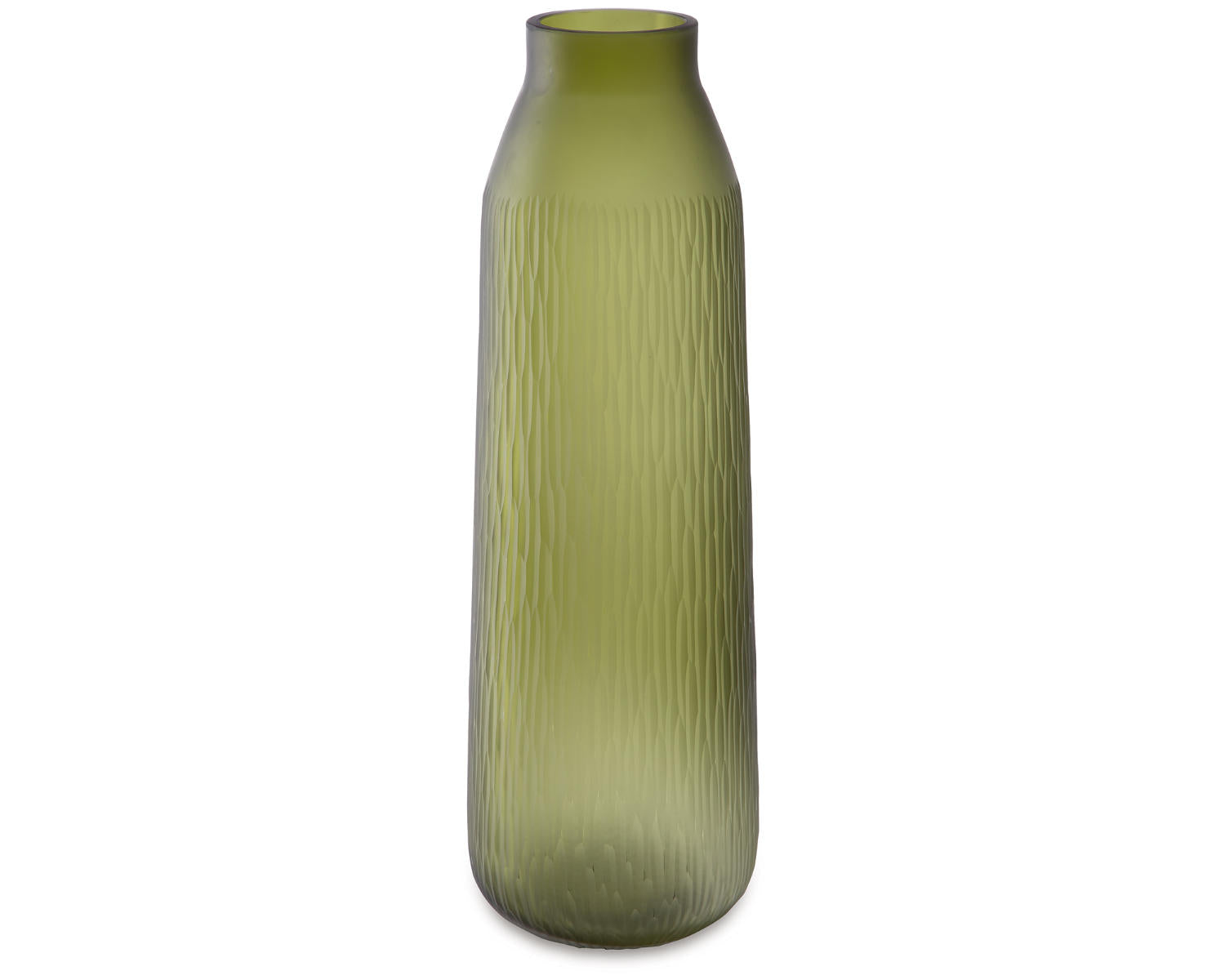 Vase. Indoor/outdoor safe. Olive green finished carved glass.