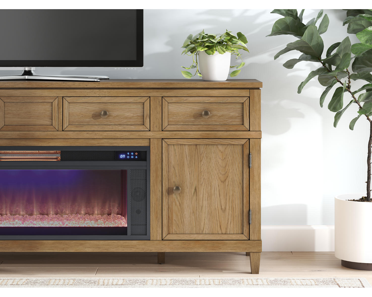 Taking a timeless approach to casual beauty, this TV stand with electric fireplace brings easygoing elegance to the everyday. The light brown wood-tone finish seamlessly slips into your room’s aesthetic. Two spacious cabinets (each with an adjustable shelf) and four drawers offer plenty of storage for media and electronics. Creating an even cooler ambiance, the fireplace insert gives you the cozy feel of a fireplace without the added hassle. With the touch of a button, adjust the temperature and the color-changing flames, and set the timer for long-lasting enjoyment. Built-in wireless speakers further elevate the entertainment experience.