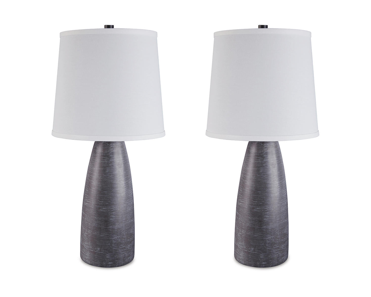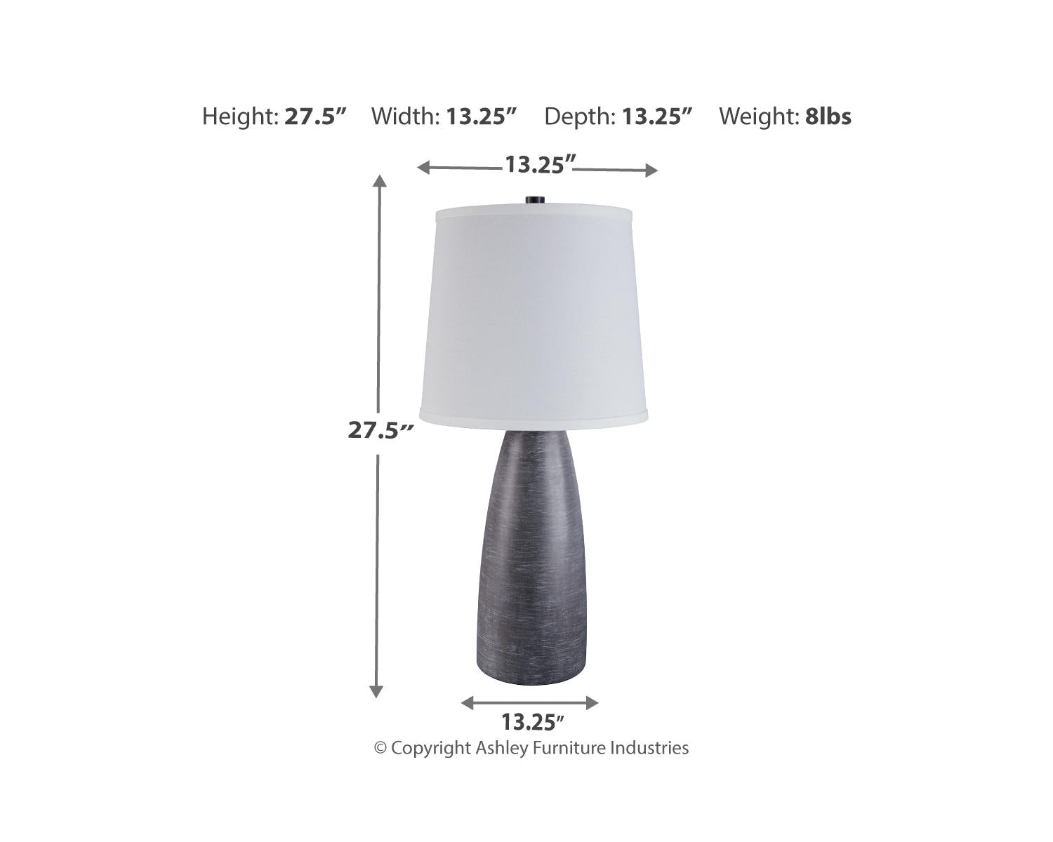Gray finished table lamp. Modified drum hardback shade. 3-way switch. (1) E26 socket, type A bulb recommended - 150 watts max or 25 watts max CFL.