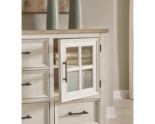 This dresser and mirror set elevates the art of modern farmhouse design. Its two-tone aesthetic blends antiqued white and light grayish brown for a charming finish. Framed drawer fronts and windowpane cabinets lend a country feel. Conveying a feeling of relaxed comfort, this set is sure to carry you away to a dreamy time and place.