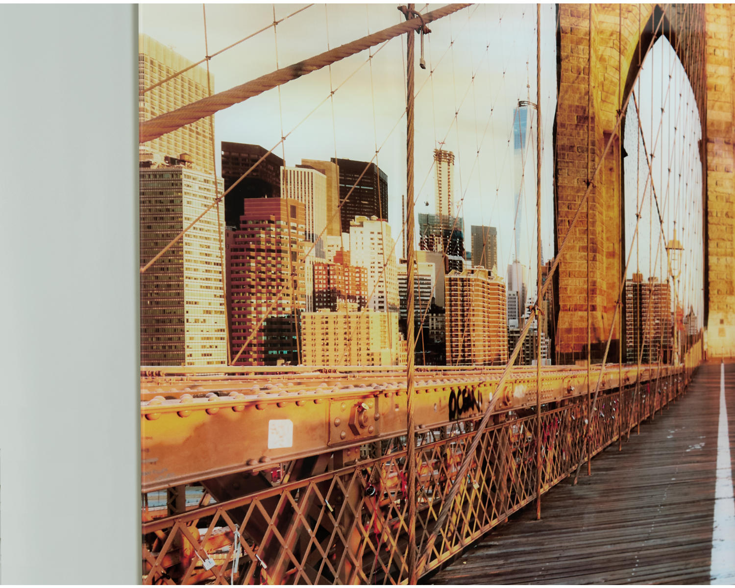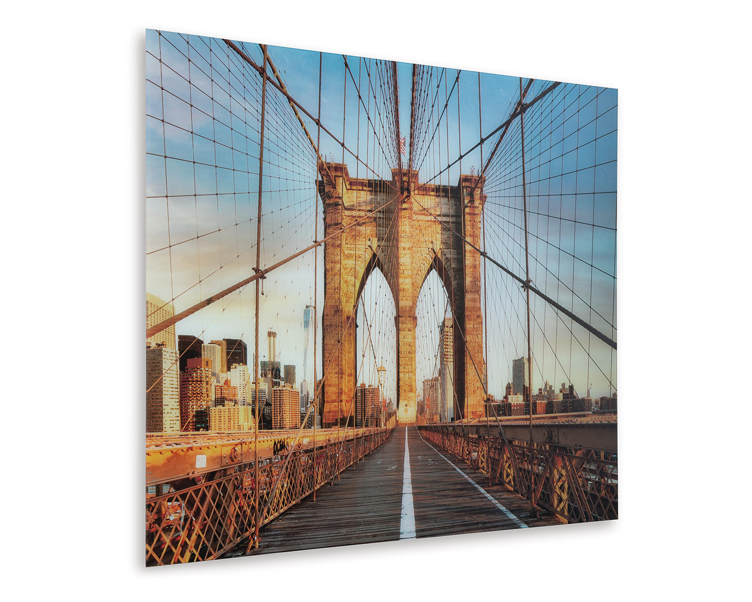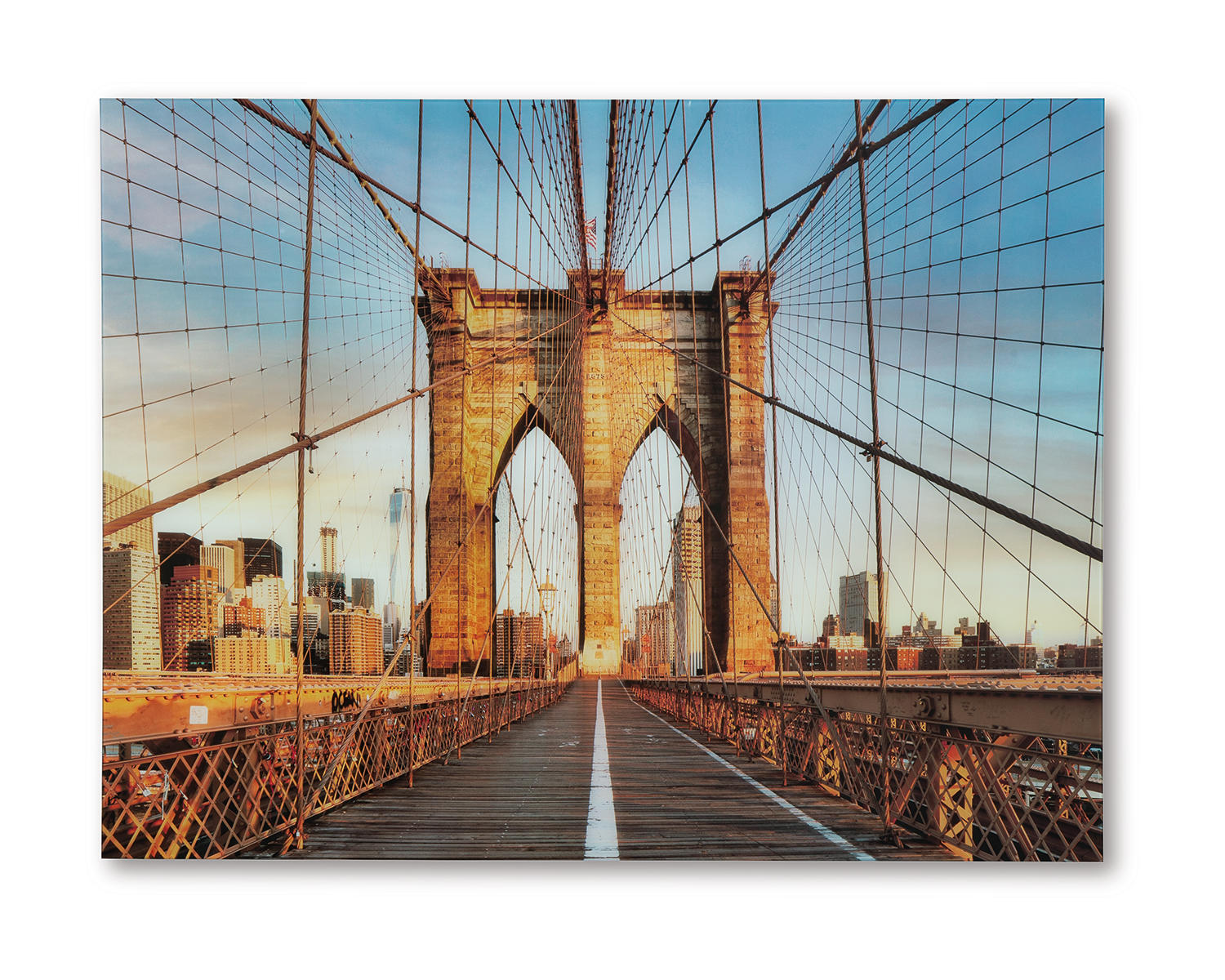 Bring a touch of iconic architecture to your home with this wall art. Captured in beautiful detail, the print on glass showcases the Brooklyn Bridge's majestic arches and intricate cables, set against the backdrop of a vibrant city skyline. This captivating scene is sure to transport you to the heart of New York City every time you look at it.