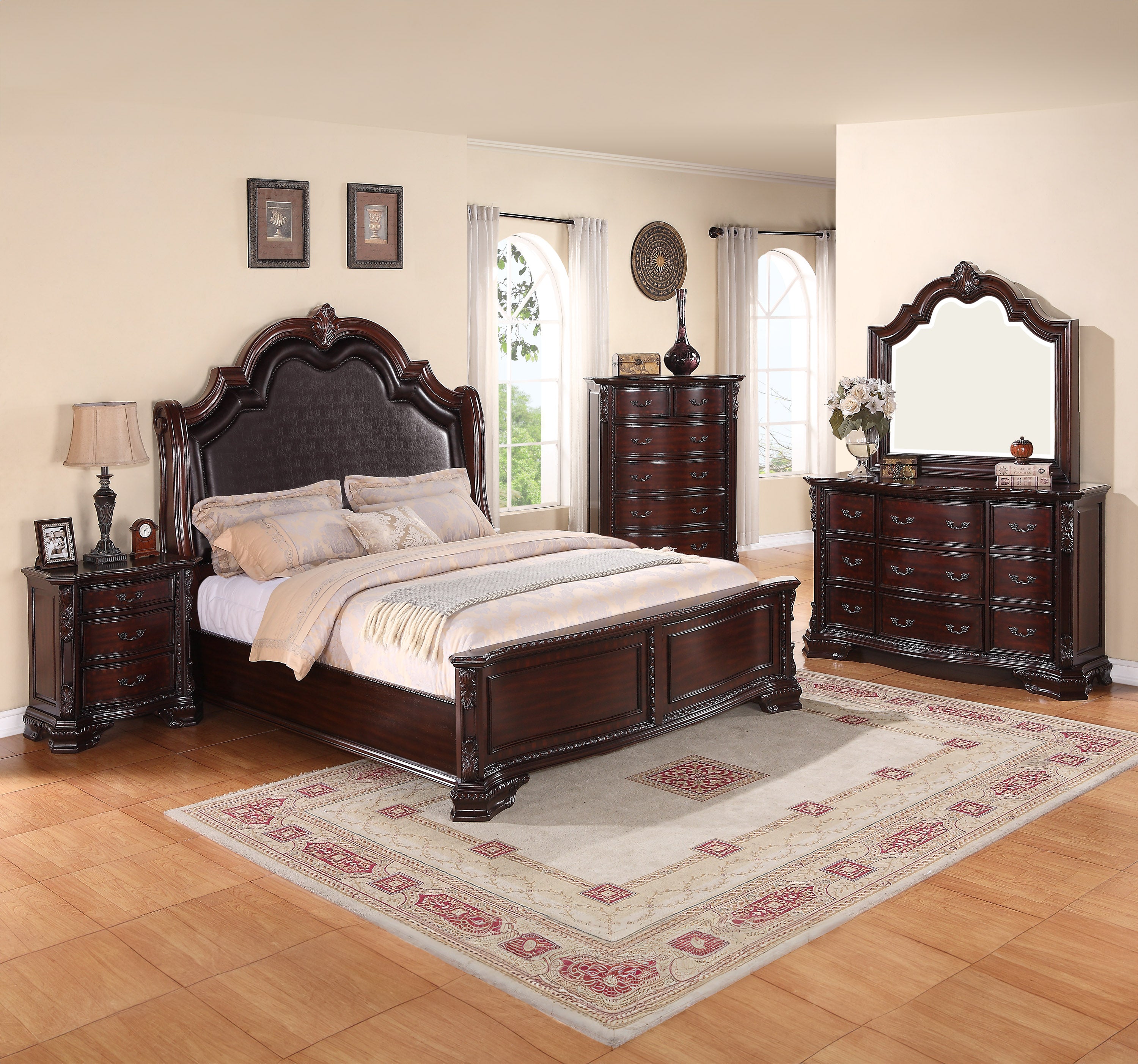 Featuring the epitome of grandeur and sophistication, this bedroom ensemble exudes a timeless charm that instantly elevates the aesthetics of any sleeping quarters. Anchored by a majestic bed with an intricately designed, high-back headboard upholstered in a easy care leatherette, the set promises luxurious comfort and an air of regal elegance. Complementing the statement piece are exquisitely crafted furnishings that include a night stand, chest of drawers and a commodious dresser with a gracefully curving mirror. Each piece boasts classic silhouettes, rich finishes, and ornate detailing such as antique-style brass handles that add a touch of vintage finesse.