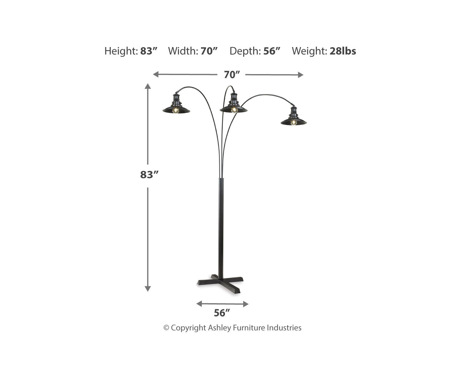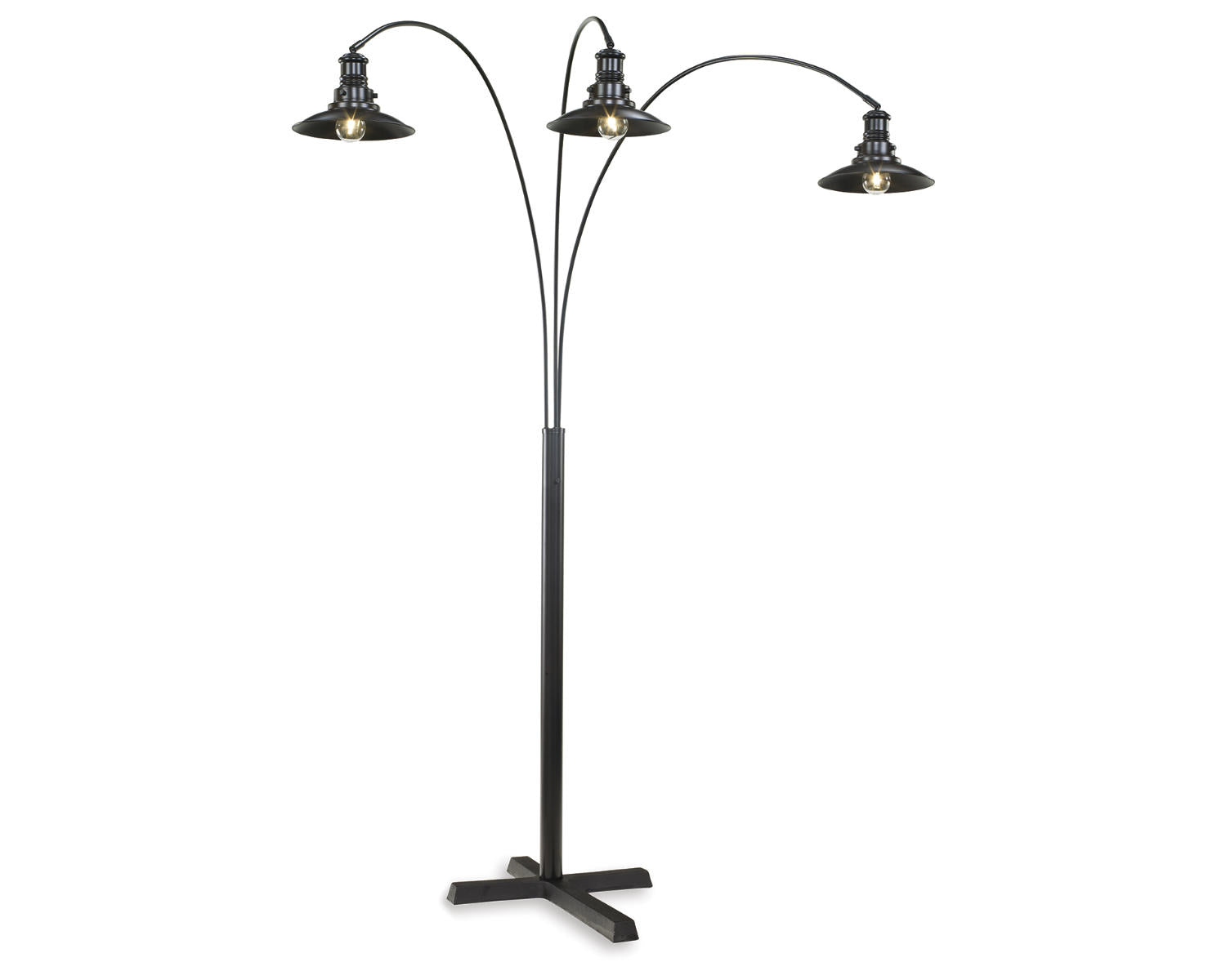 Black finished metal arc lamp. Metal shades. Adjustable arm and neck. Dimmer Switch. (3) E26 socket, type A bulb recommended - 60 watts max or 13 watts max CFL.