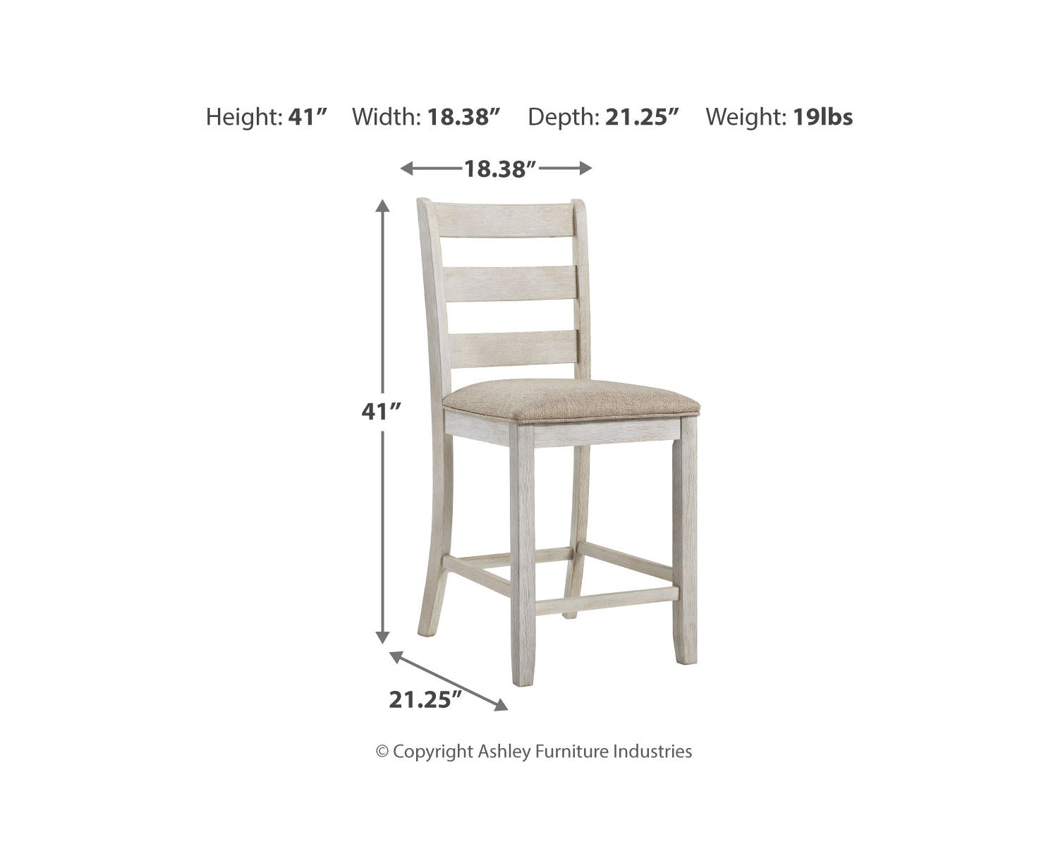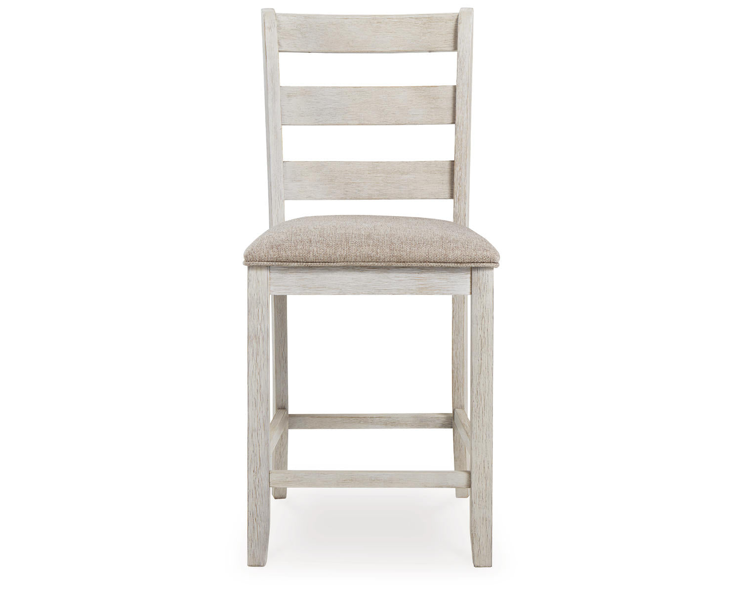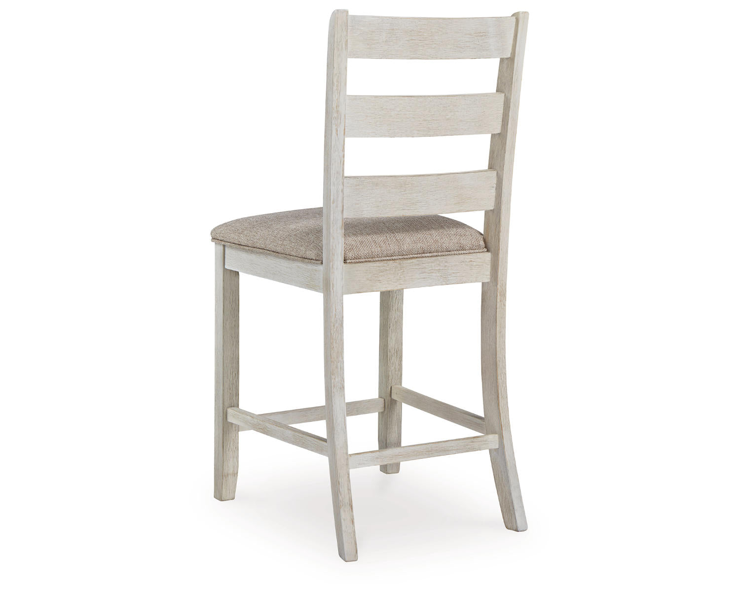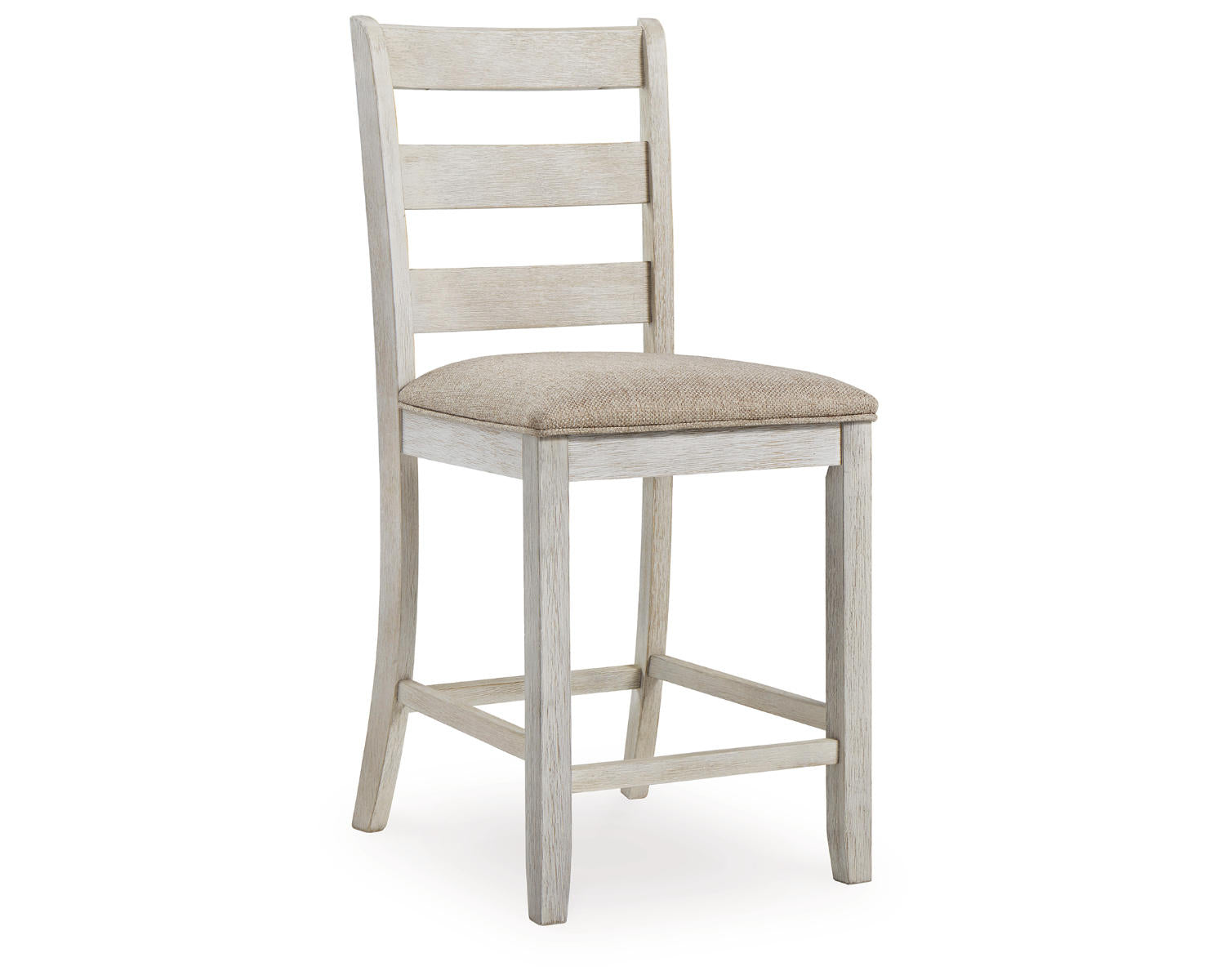 This upholstered bar stool invites you to raise the bar on small space living. An inspired choice for coastal chic or modern farmhouse settings, this comfortably cushioned bar stool with classic ladderback styling sports a grayish white finish with rub through effect for timeworn appeal.