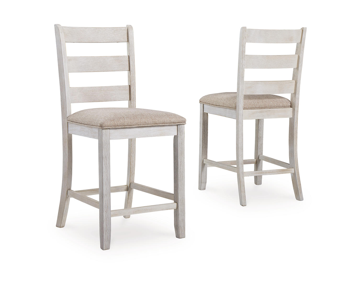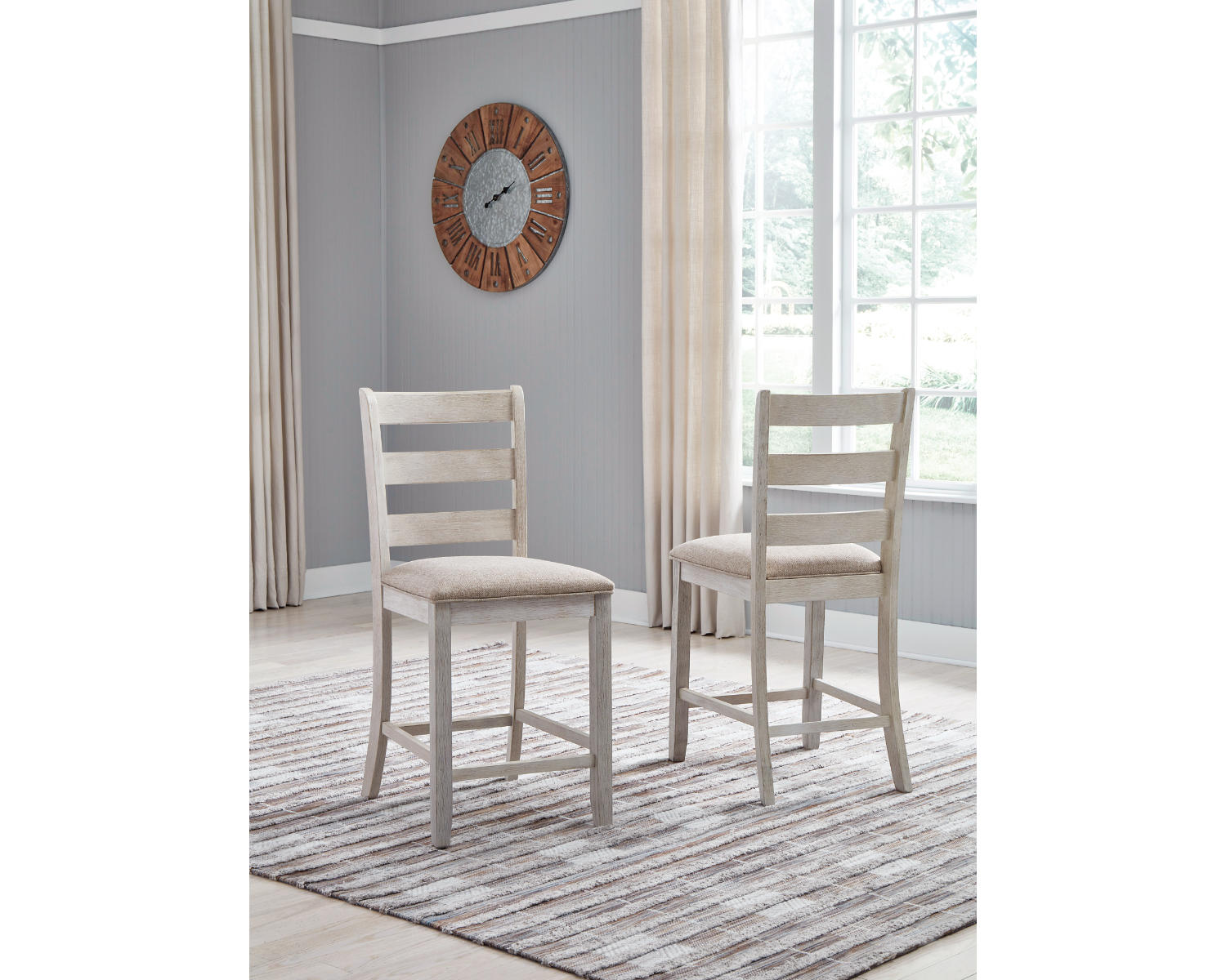 Made with Acacia veneers and select rubberwood solids, in a grayish white finish with rub through effect for a time worn appearance. Top is finished in a medium toned brown color with a planked effect with saw kerf distressing. Chair has a classic casual design with a tall ladder back look with simple features. Seat is covered in a light colored fabric cover. D394-32 pairs with 4 counter height stools. Built-in 8-bottle wine rack and open shelves. D394-024 cushioned saddle seat with a light textural polyester fabric. D394-113 barstool dimensions: 21"W x16"D x 24"H. Multi functional dining table features two convenient side drawers and a storage bin on each end for maximum use of space. Storage on the ends for maximum use of space. Finished in a trend right gray washed color with contrasting light oak colored top. Solid wood chair frames with cushioned seat in light gray woven polyester fabric. Piano style bench with under seat storage bin. D394-423 counter height dining set includes 6 stools and counter height leg table. Two-tone finish with a brown wood tone top contrasted with a grayish white with rubbed through effects.