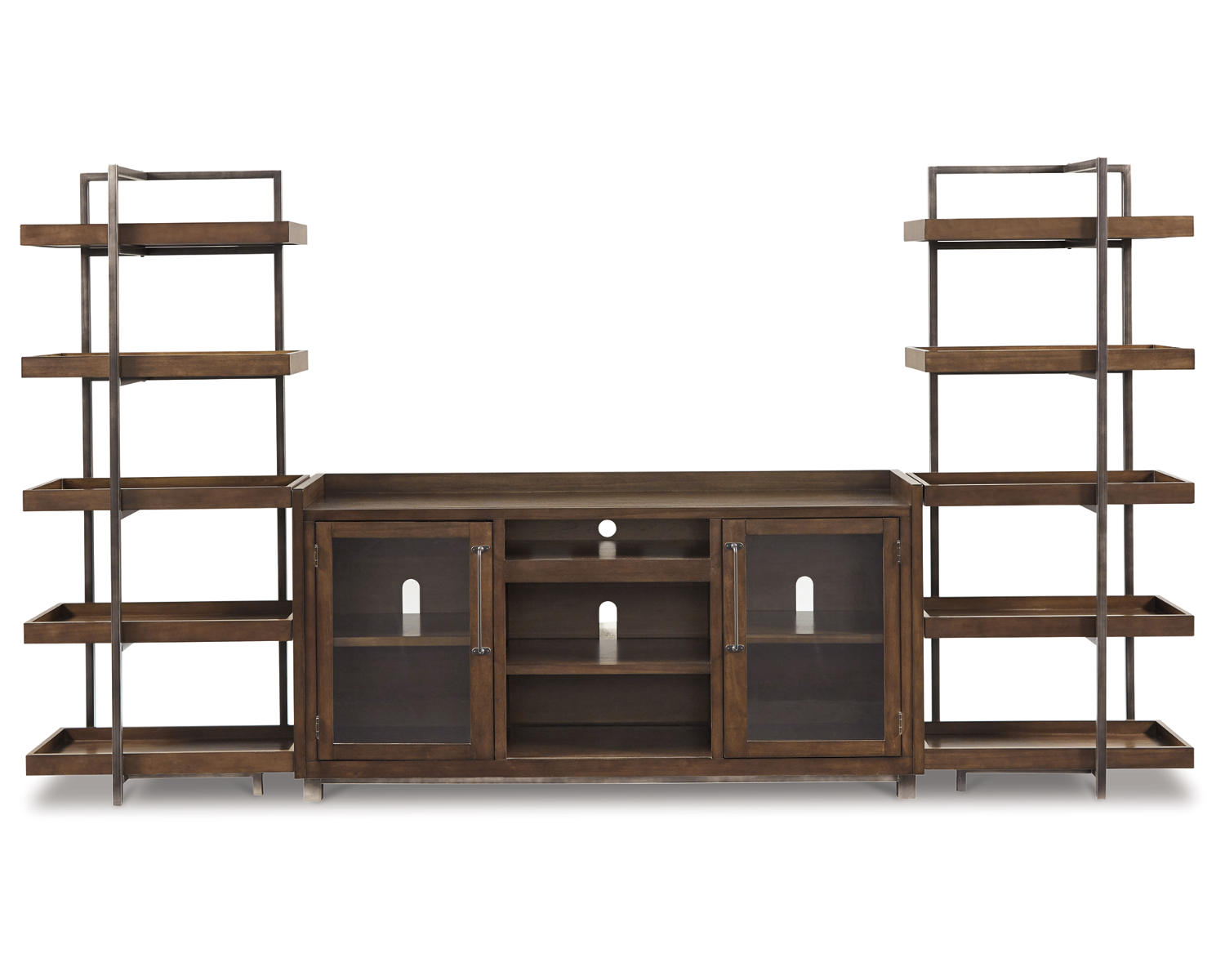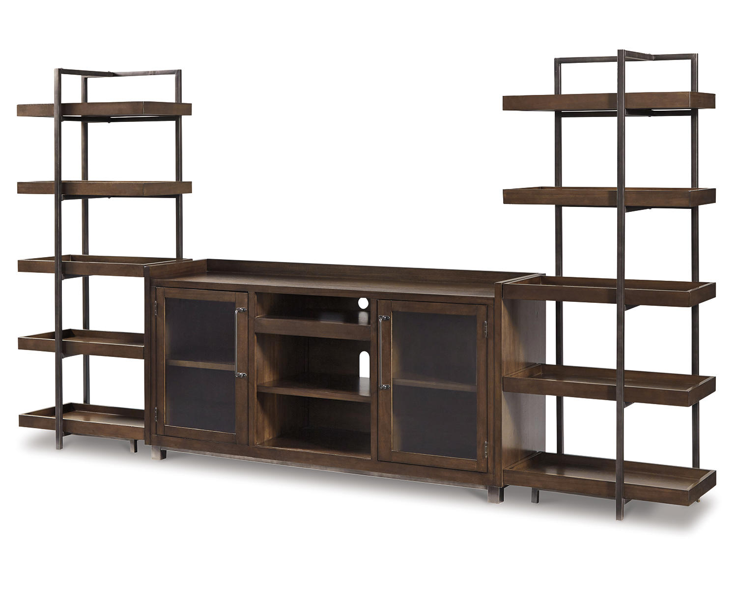 For fans of urban industrial design, this 3-piece entertainment center clearly steals the show. Its blend of acacia veneer and wood is beautified with an oiled walnut-tone finish for a highly contemporary aesthetic with grainy, earthy character. Infusion of dark bronze-tone metal takes the cool character to another level. While the look might be richly substantial, open-concept piers and glass-front cabinets lighten the mood. And for your added viewing pleasure, this entertainment center is compatible with our electric fireplace inserts (sold separately).