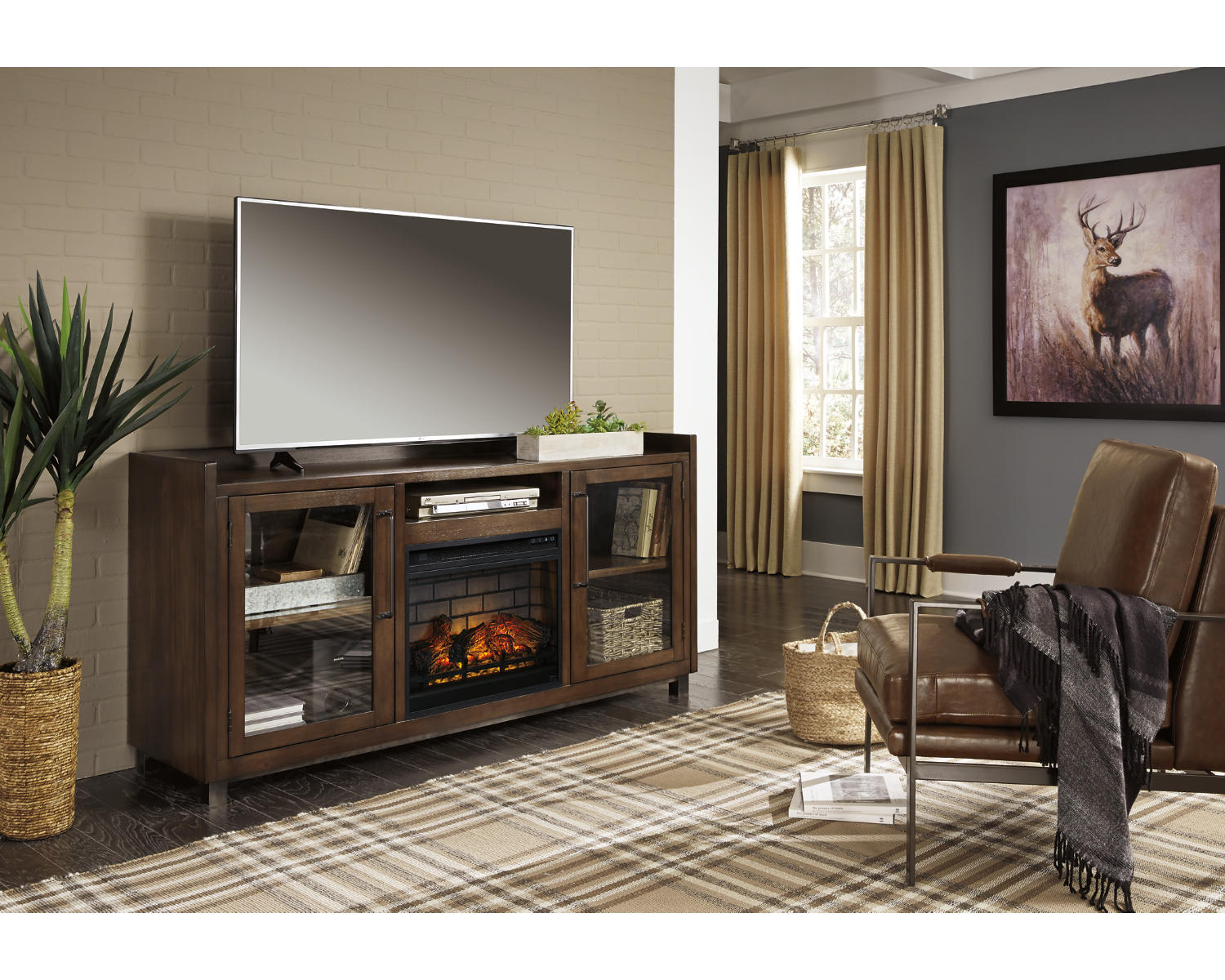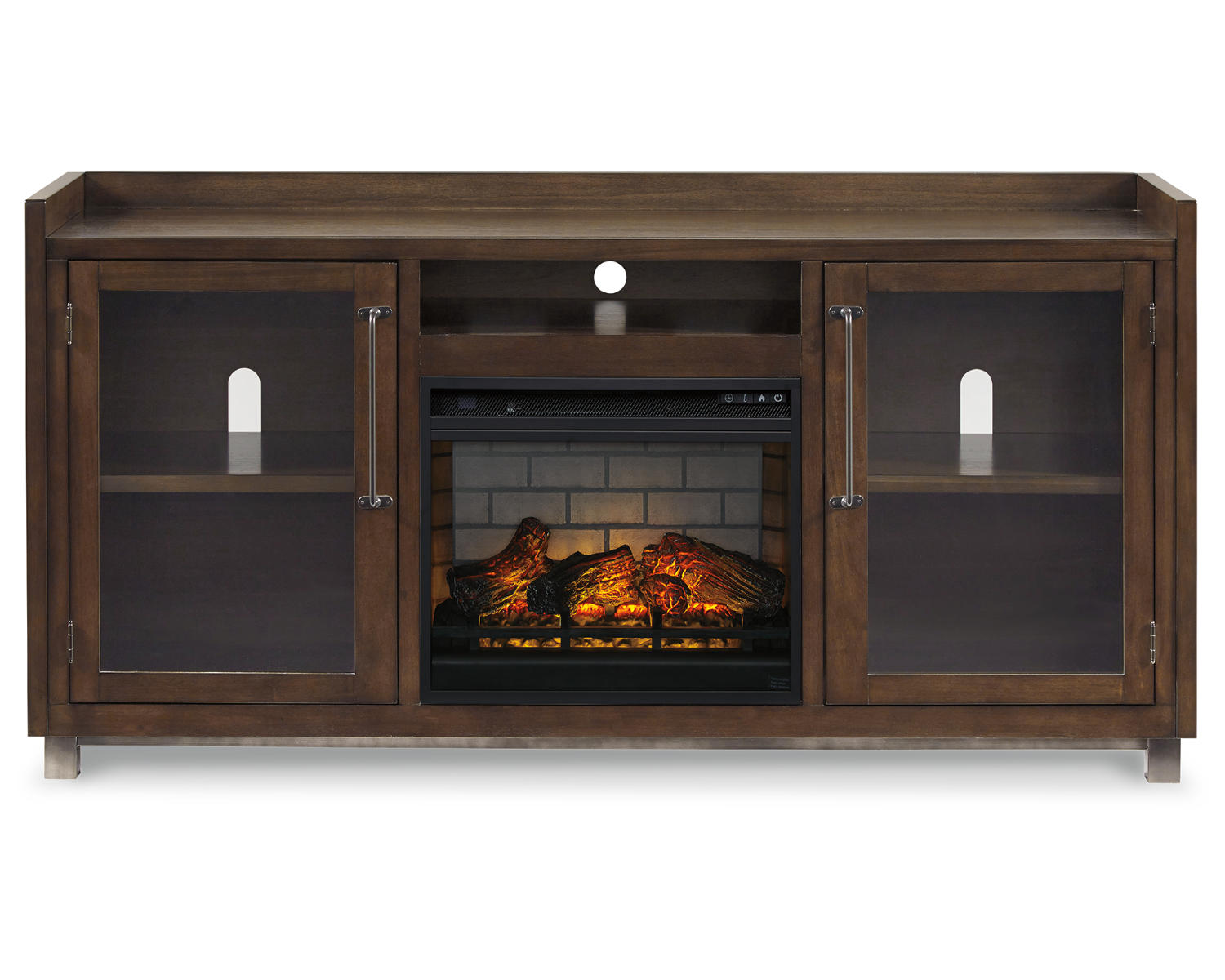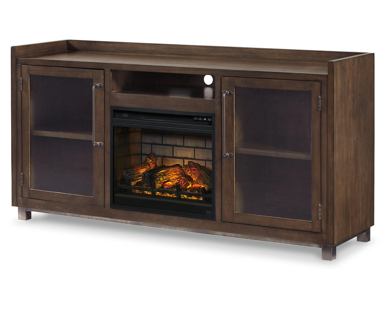 For fans of urban industrial design, this TV stand with fireplace insert clearly steals the show. Its blend of acacia veneer and wood is beautified with an oiled walnut-tone finish for a highly contemporary aesthetic with grainy, earthy character. An infusion of dark bronze-tone metal takes the cool character to another level. What really turns up the heat: an electric infrared fireplace insert with faux firebrick surround that operates with or without infrared heat. With the touch of a button, adjust the temperature and the flame brightness, and set the timer for long-lasting enjoyment.