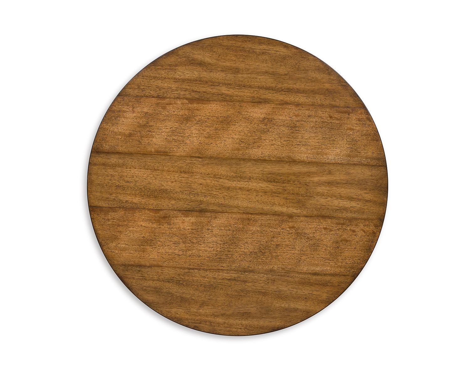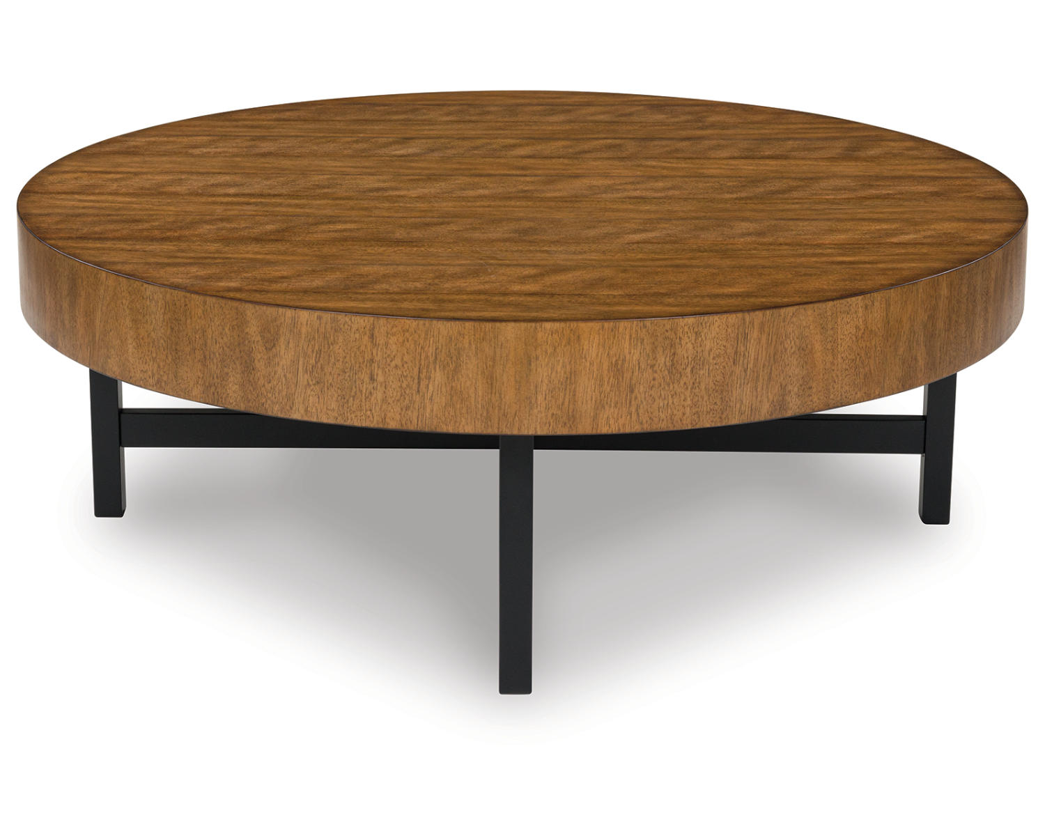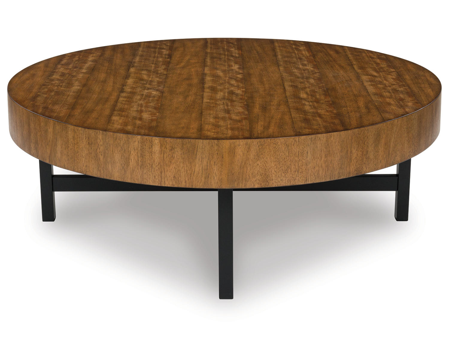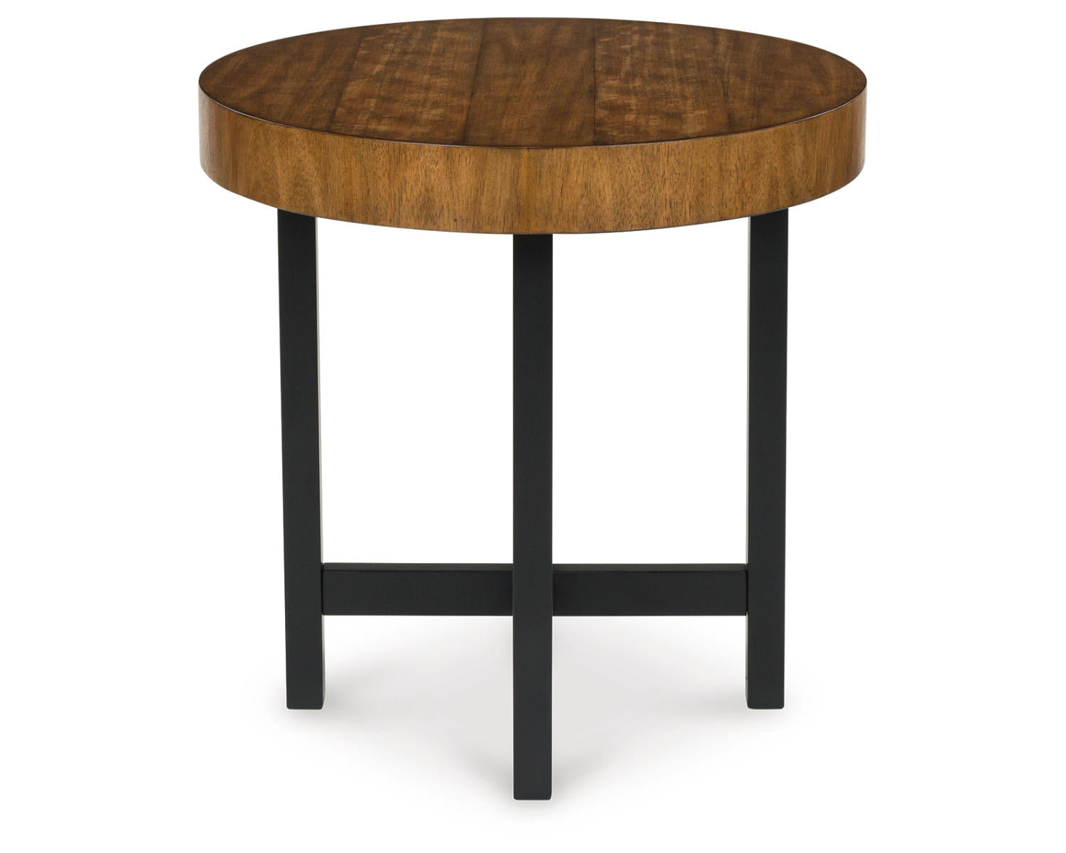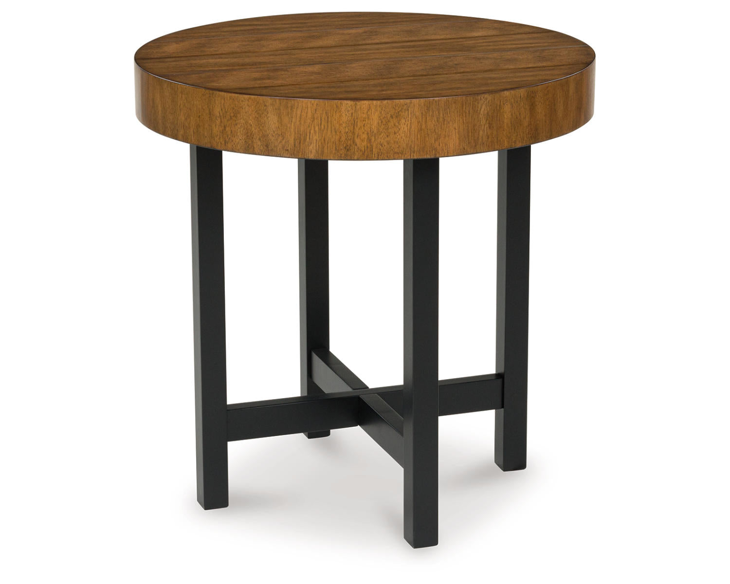 Urban contemporary design. Made with black metal frames, rubberwood solids, mango wood veneer and MDF substrate. Thick table tops feature a natural looking wood finish. Round tables help make the most of your small space by bunching the short end table with the cocktail table for a trend-right style statement. 2-in-1 pack. The end table measures 24"W x 24"D x 24"H.
