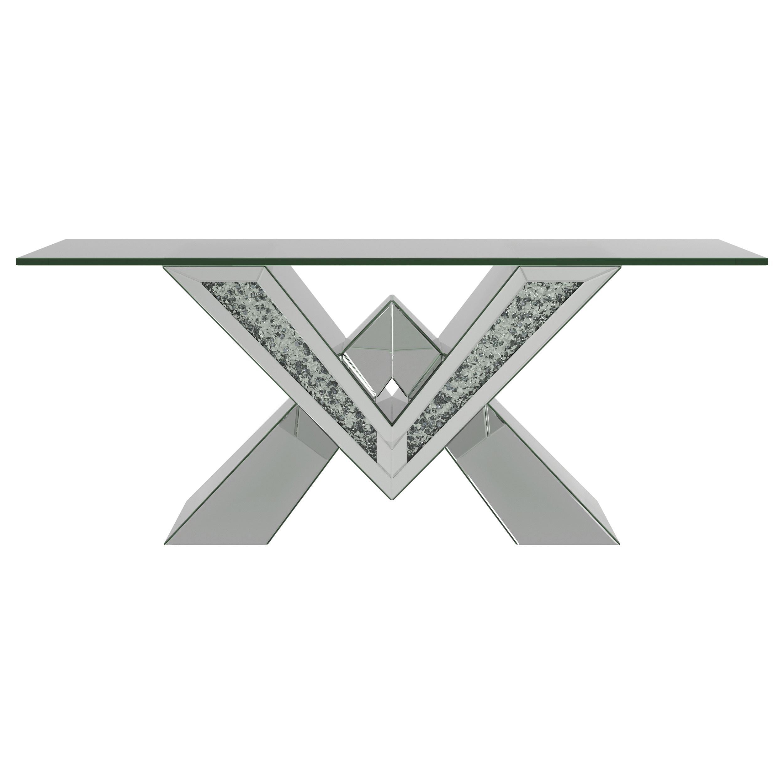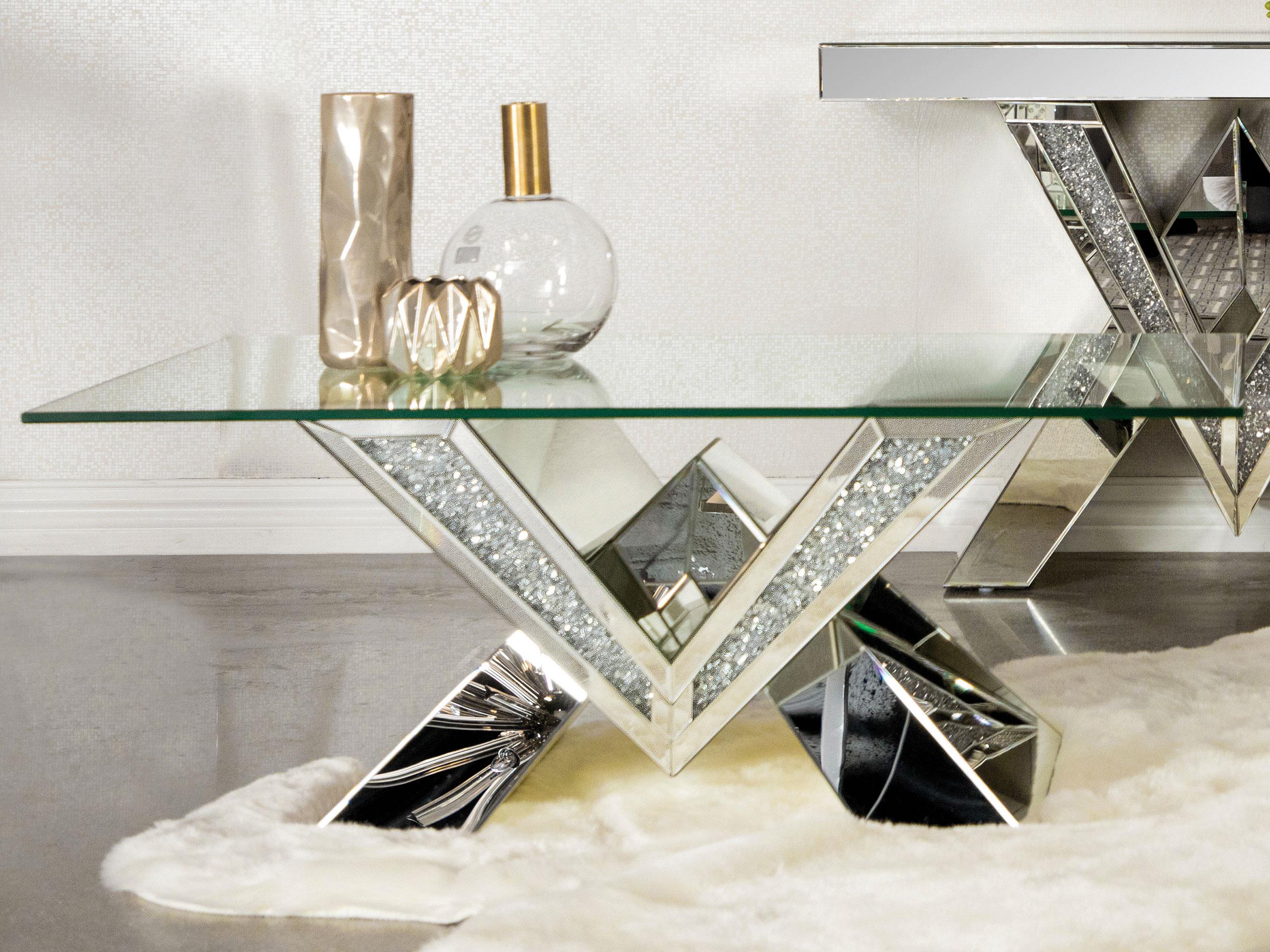 This mirrored coffee table serves as a stunning centerpiece with its bold design. The V-shaped base showcases mirrored panels and sparkling crystal accents for an opulent look. The rectangular, beveled tempered glass top adds elegance and practicality, making this table ideal for entertaining or displaying decor. A striking blend of luxury and modern aesthetics, it elevates any living space.