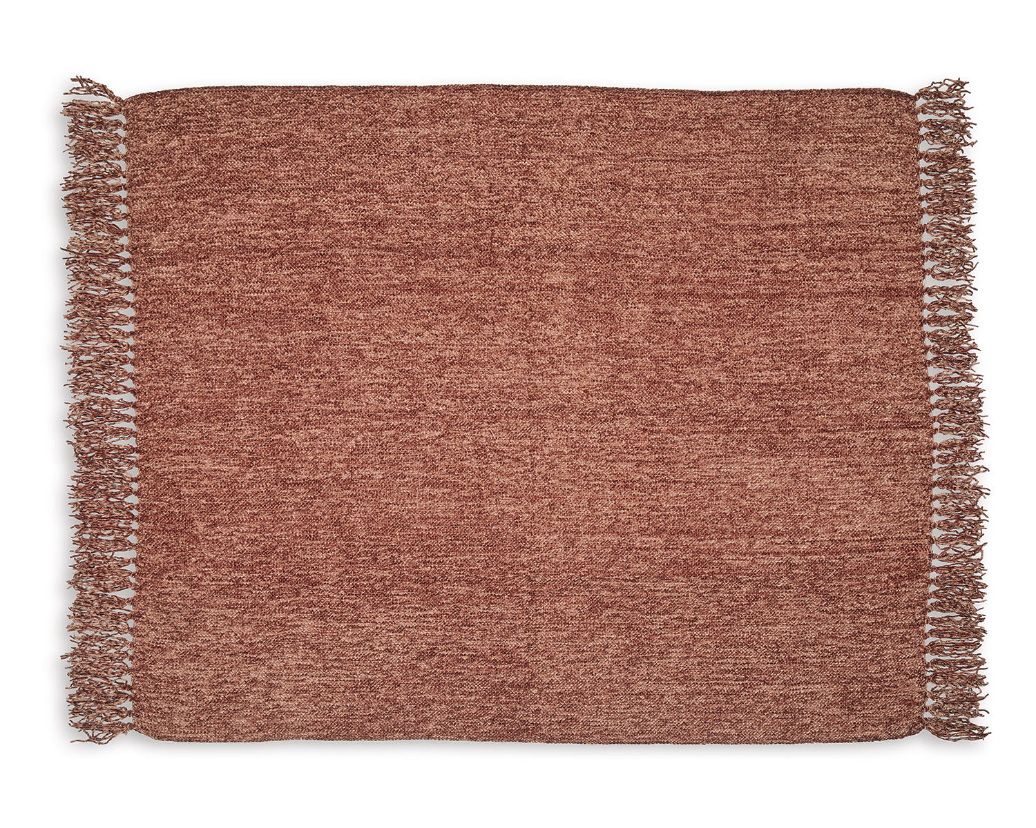 Woven solid in rust. Knotted fringe in rust. Polyester. Dry clean only.