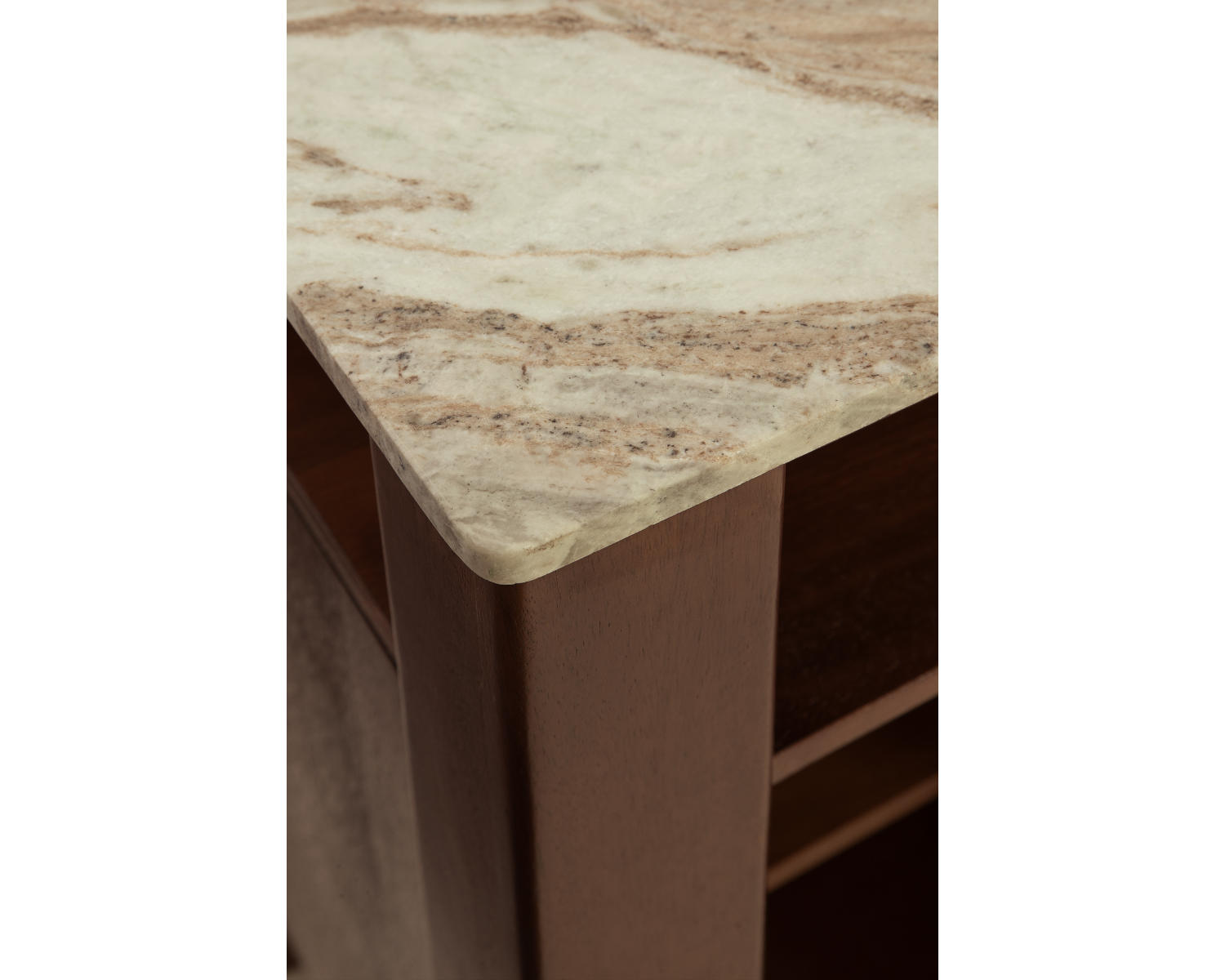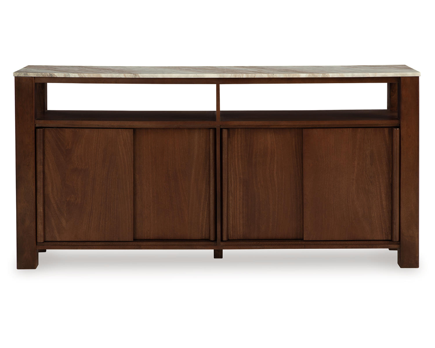 Accent cabinet. Constructed of mango solid, veneer and engineered wood in dark brown finish. Taupe, white and gray marble top. 4 sliding doors and 2 shelves. Rounded wood bar door pull.