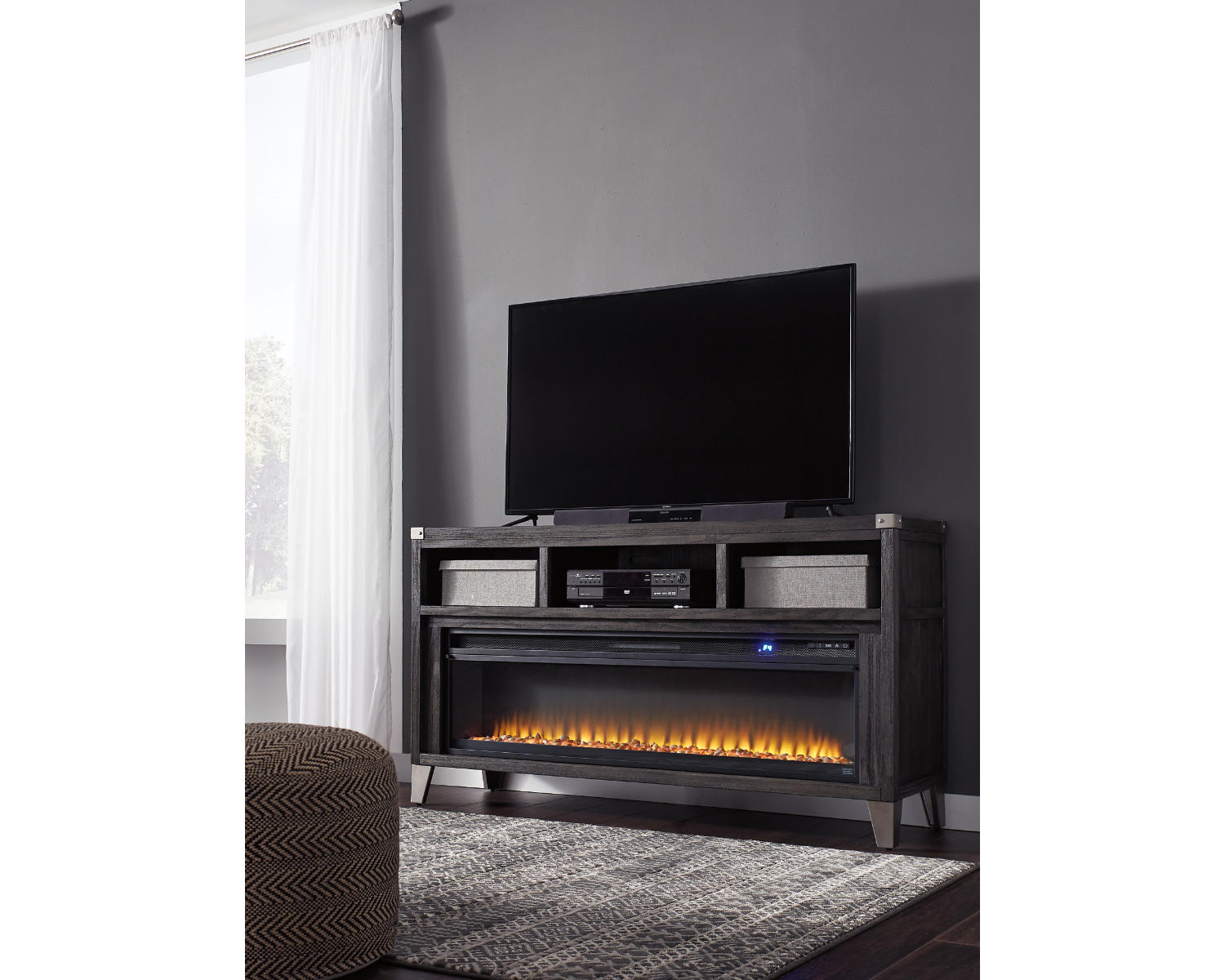 Make watching TV a joy with this large TV stand. Its top surface accommodates TVs up to 70 inches. The stand's rustic-industrial style—with a gray finish, squared edges, zinc-tone corner bracket accents and nailhead detailing—is sure to complement any contemporary decor. Several vented open cubbies offer impressive shelf space, convenient for keeping all of your electronic gear within reach. Handy cutouts keep cords out of sight. For your added viewing pleasure, the wide fireplace insert gives you the cozy feel of a fireplace without the added hassle. With the touch of a button, adjust the temperature and the color-changing flames, and set the timer for long-lasting enjoyment. It comes with faux glass crystals and natural stones, so you can customize the look of the flame bed.