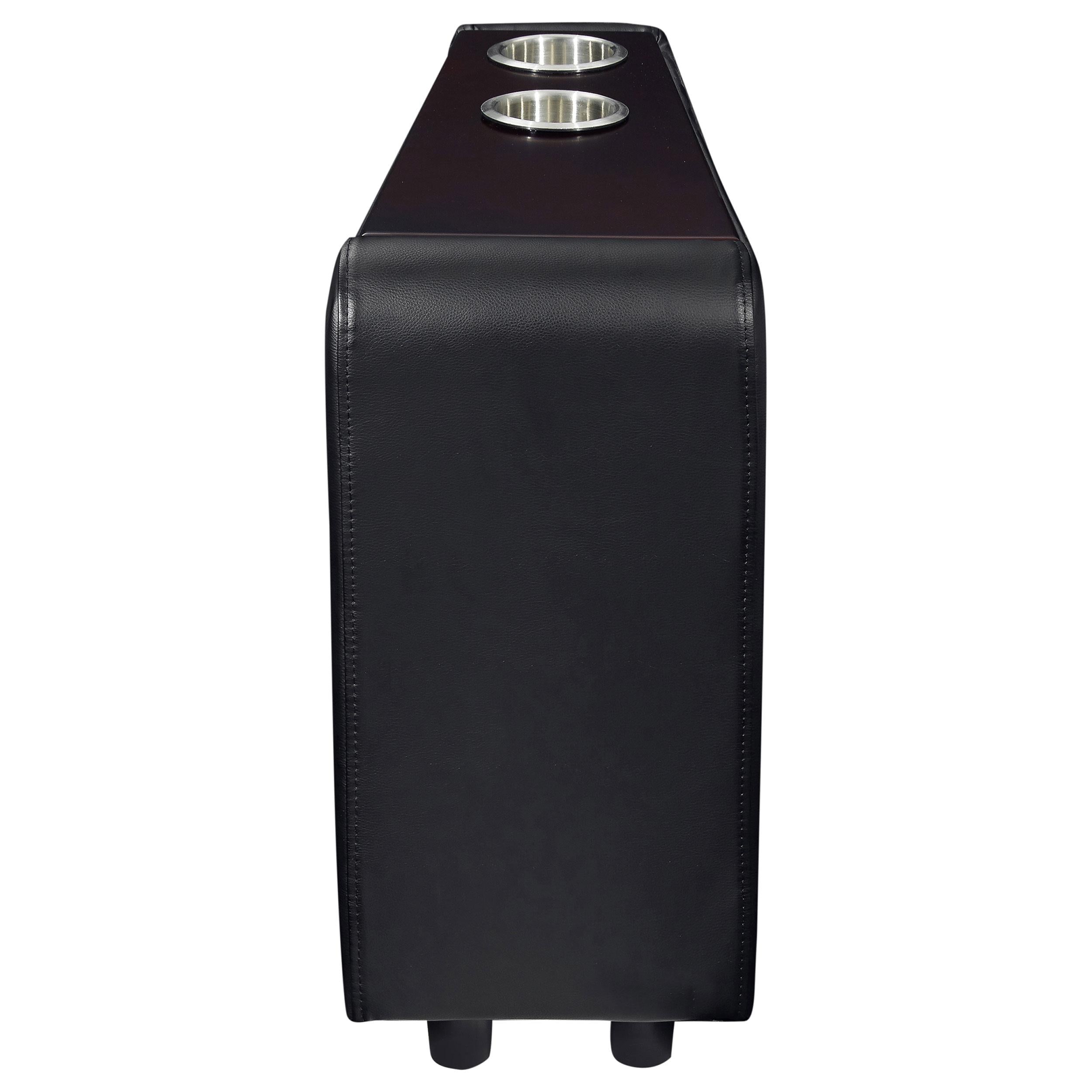 Enhance your home theater setup with this versatile wedge console, designed to fit seamlessly between two recliners. Upholstered in sleek black leatherette, it features dual stainless steel cupholders and a memory foam-padded top for added comfort. Enjoy the convenience and luxury of a personal entertainment hub.