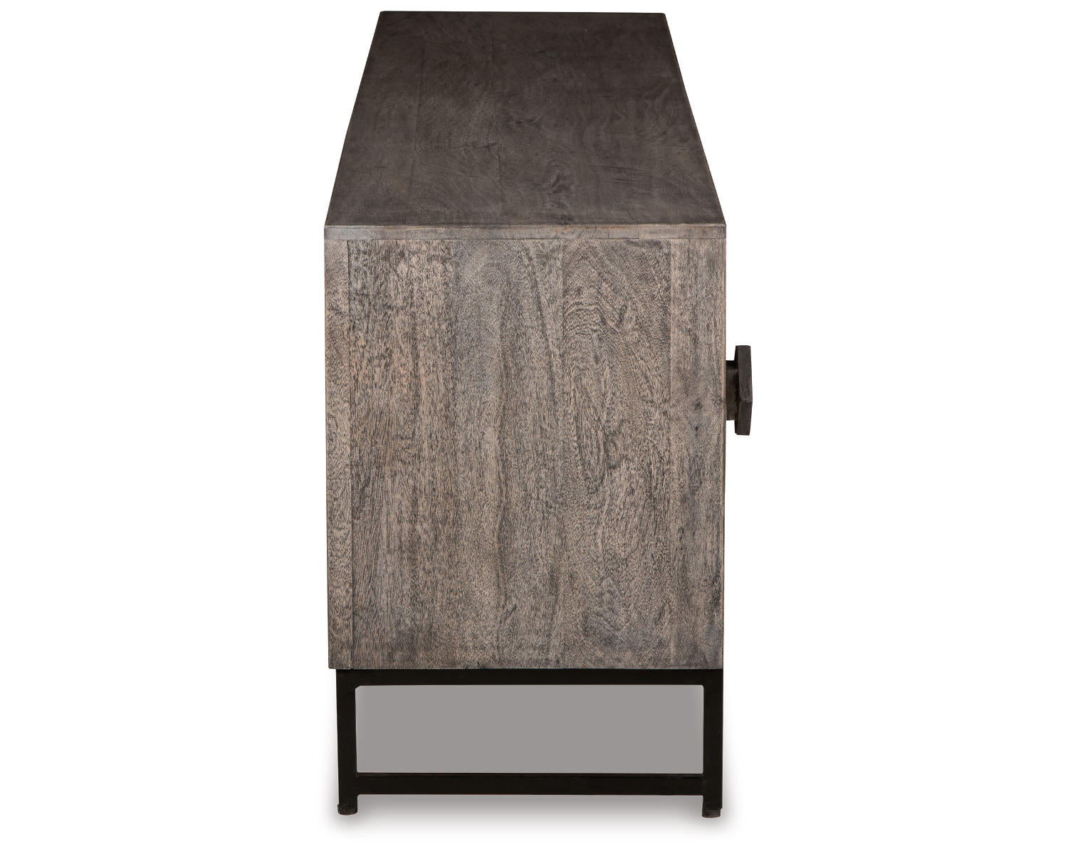 Accent cabinet. Constructed of solid wood in distressed gray finish and black finished metal. Wood door pulls. Soft close hinges.  Diamond pattern door fronts. 2 Doors and 3 shelves. Openings in back for electronics.