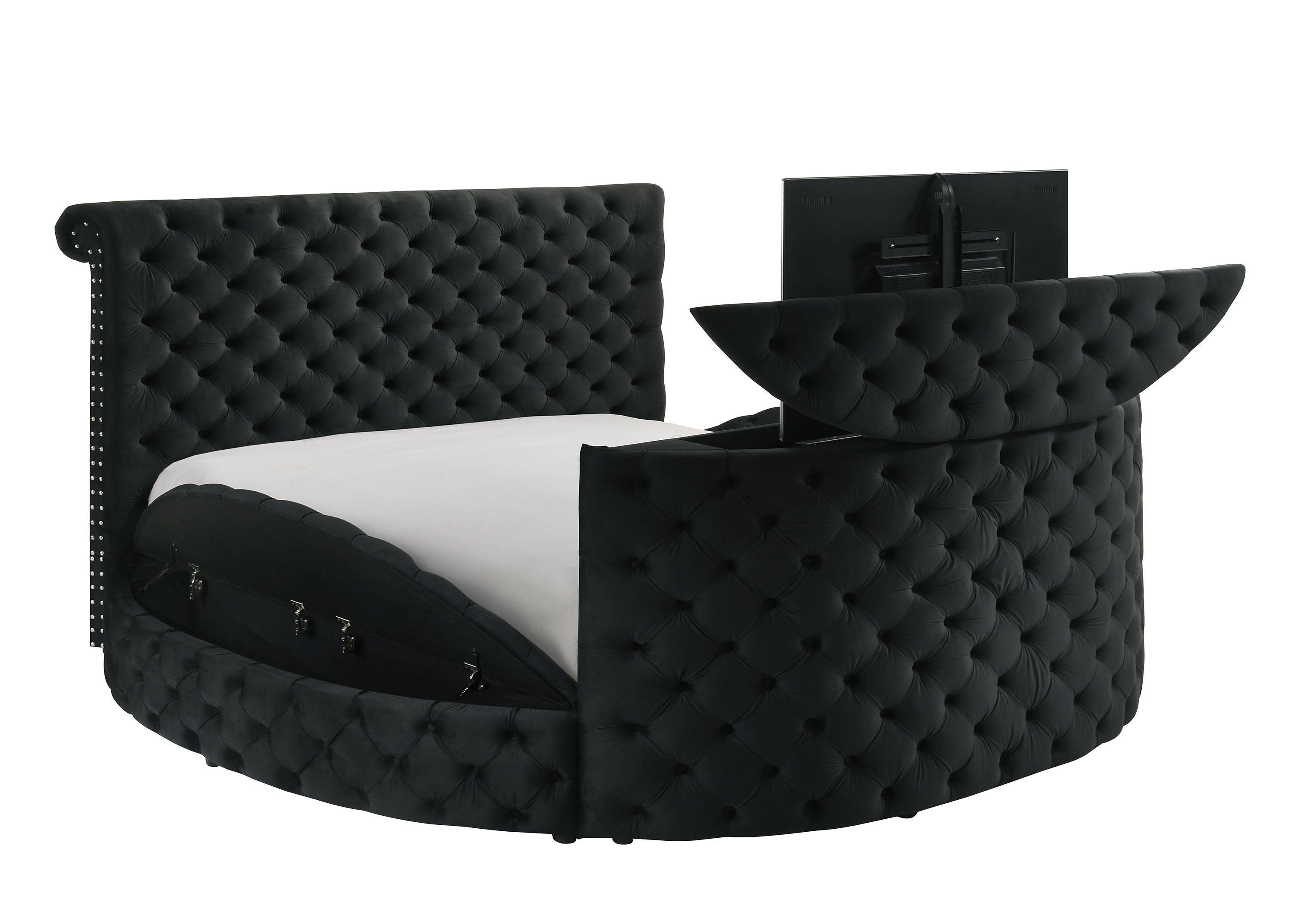 Indulge in the epitome of luxurious comfort and innovative design with this exquisite bed, a true masterpiece for those who appreciate both form and functionality in their sleeping quarters. Boasting a majestic, deeply tufted headboard with nail head trim, this bed is upholstered in sumptuous black velvet, offering a touch of opulence to any bedroom setting. The footboard features an integrated television lift mechanism, seamlessly blending entertainment with relaxation. Additionally, a built-in electric fireplace enhances the ambiance and provides a cozy, warm glow that invites you to unwind in style. The bed’s innovative round design includes a practical storage system, discreetly hidden to maintain its sleek profile. This bed is perfect for those seeking a luxurious retreat that combines modern technology with sophisticated design elements to create an unparalleled bedroom experience.