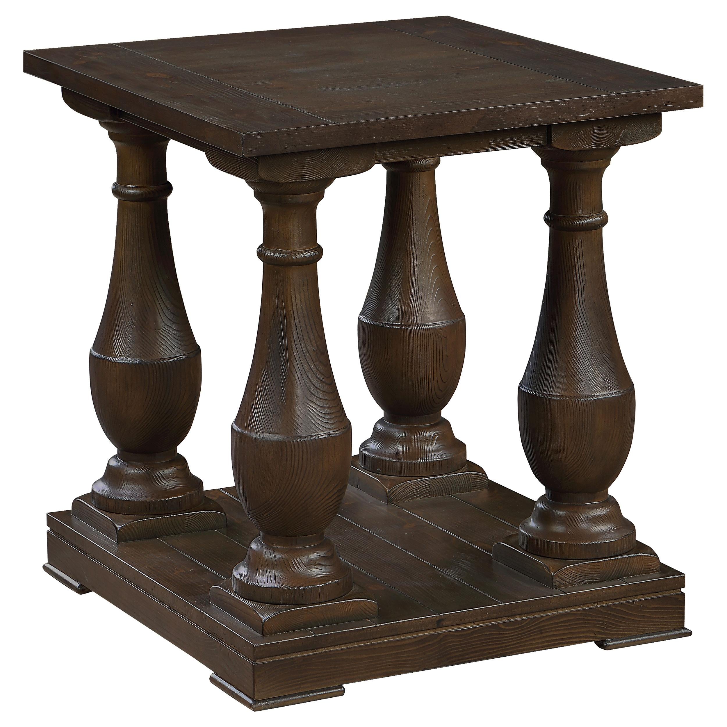 Classical silhouettes refine this transitional end table. Designed from a tropical wood material, this elegant end table offers a squared tabletop design lifted by four column-like turned pedestal legs for a timeless flair. With a plank design across the tabletop and the open bottom shelf, this end table offers up traditional touches. The deep, rich coffee brown finish also boasts a bold tone for refined, sophisticated homes and spaces. Place if aside a sofa or loveseat to keep a table lamp nearby and to showcase family photos and decor.