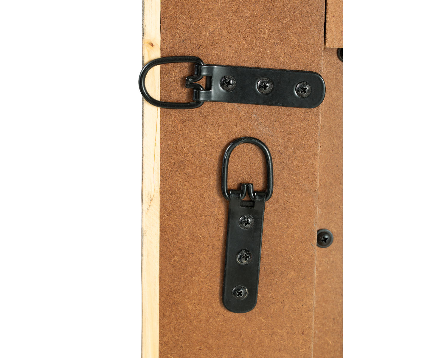 Distressed brown finished wood accent mirror. Keyhole bracket for hanging. Vertical and horizontal hanging. Due to the use of natural materials, some variations may occur.