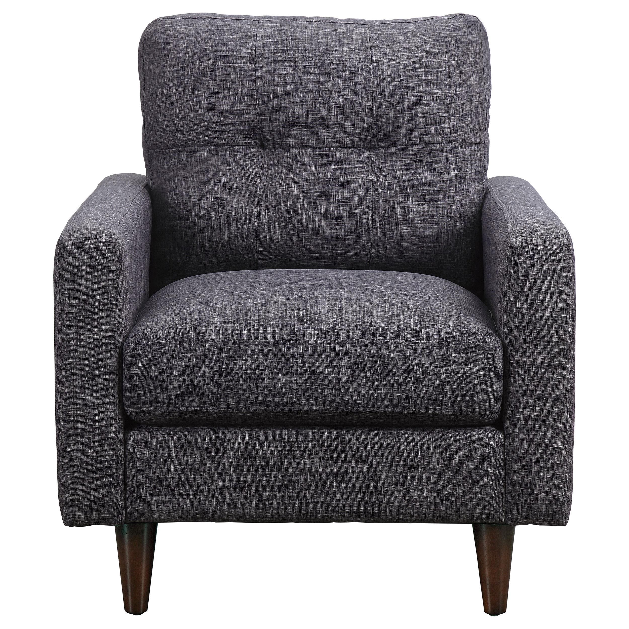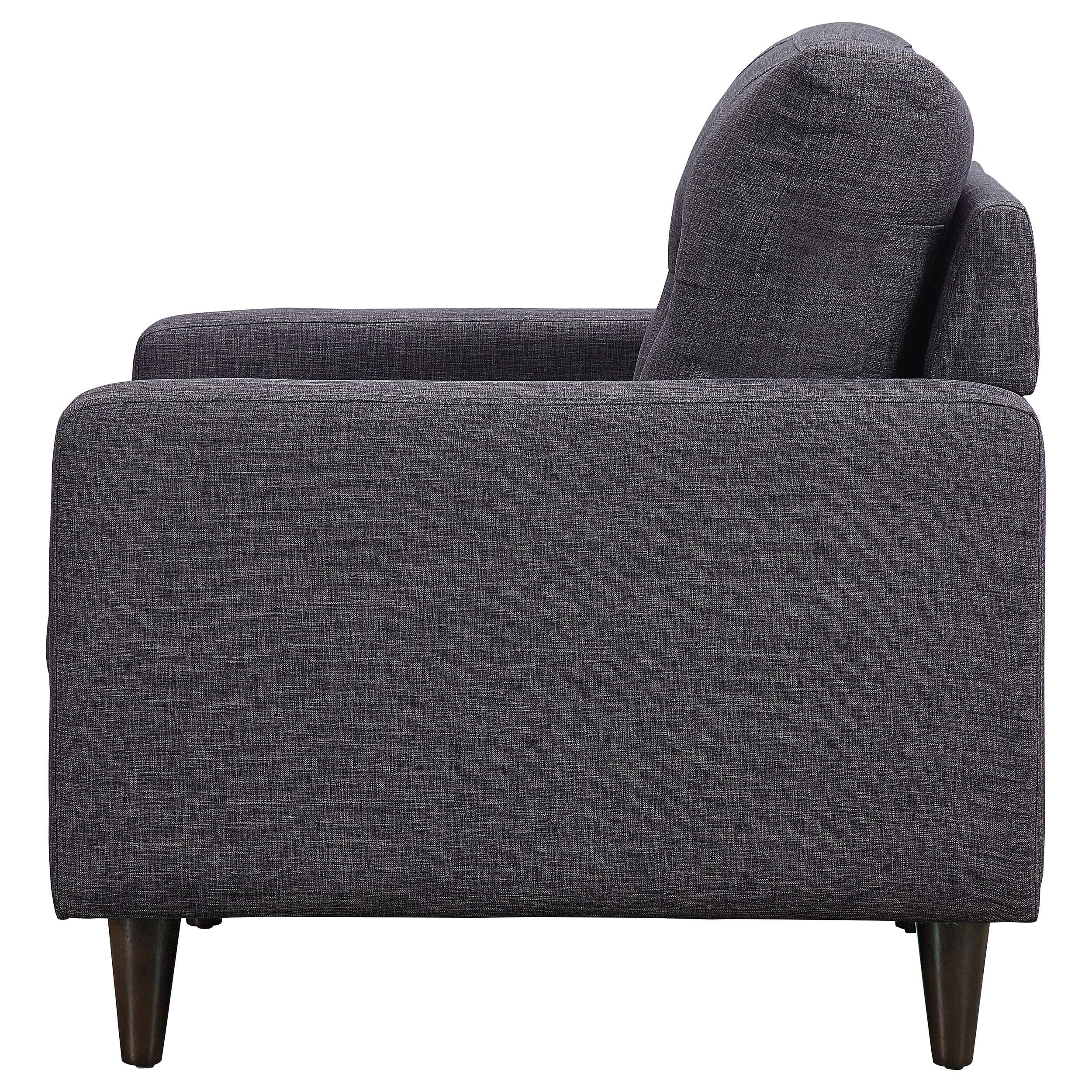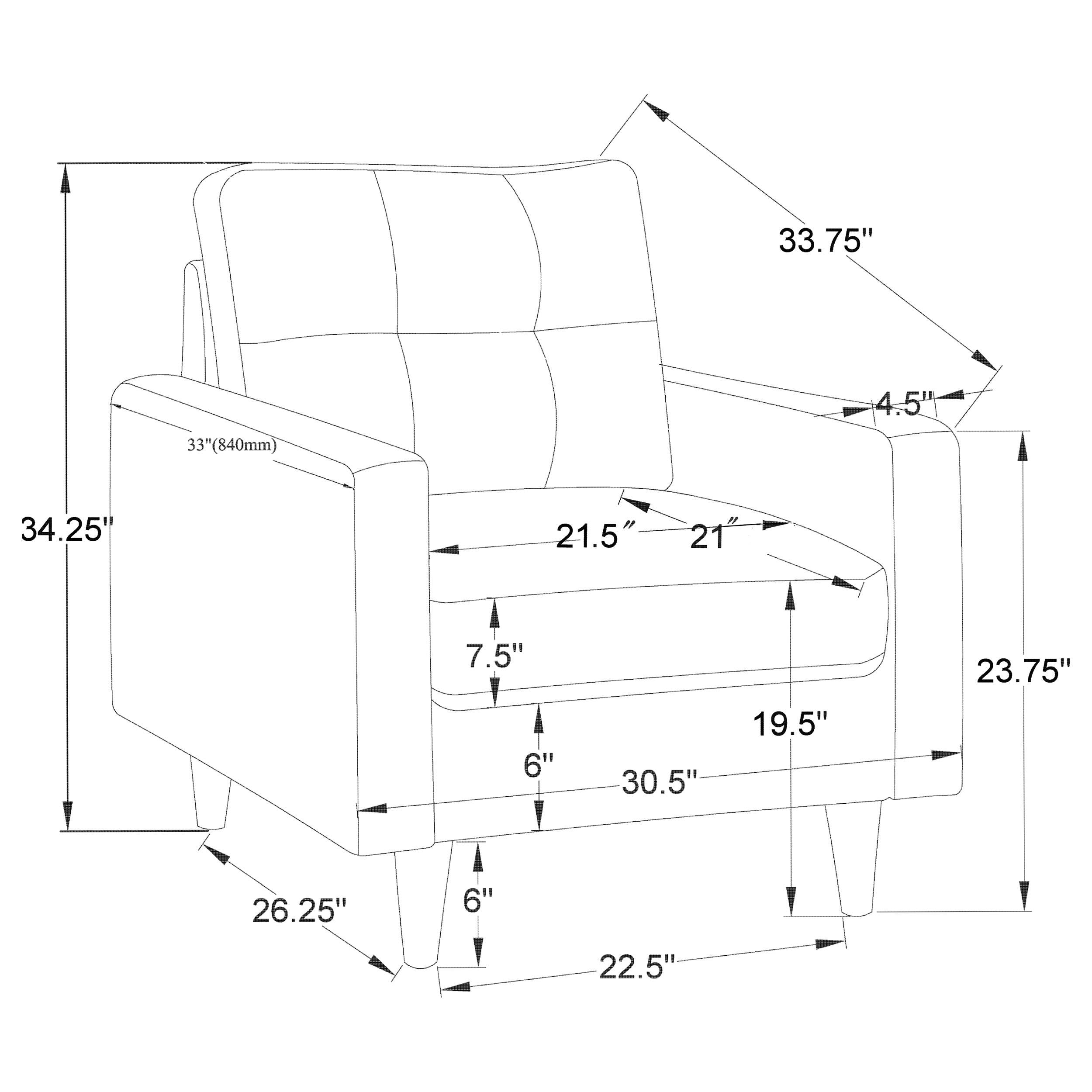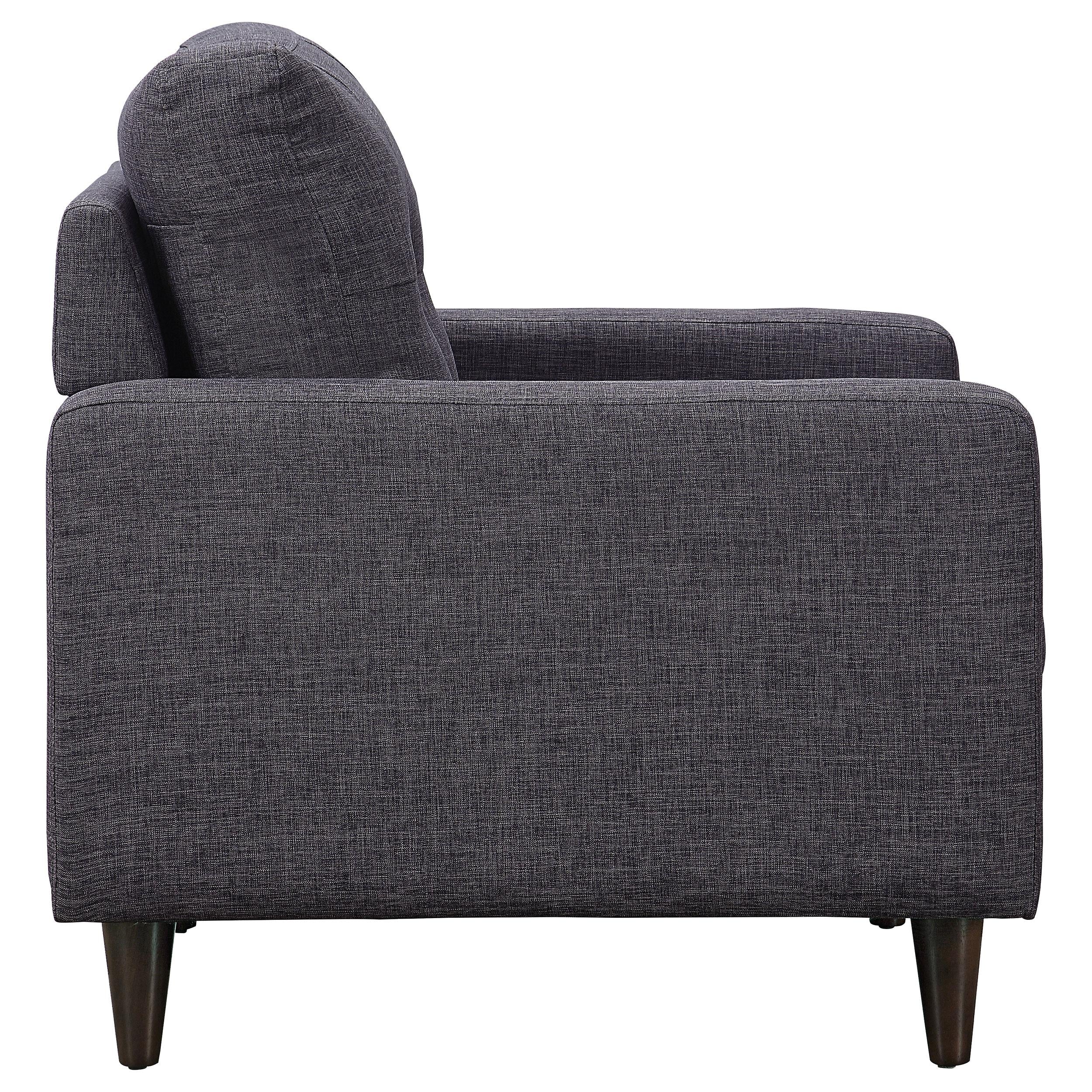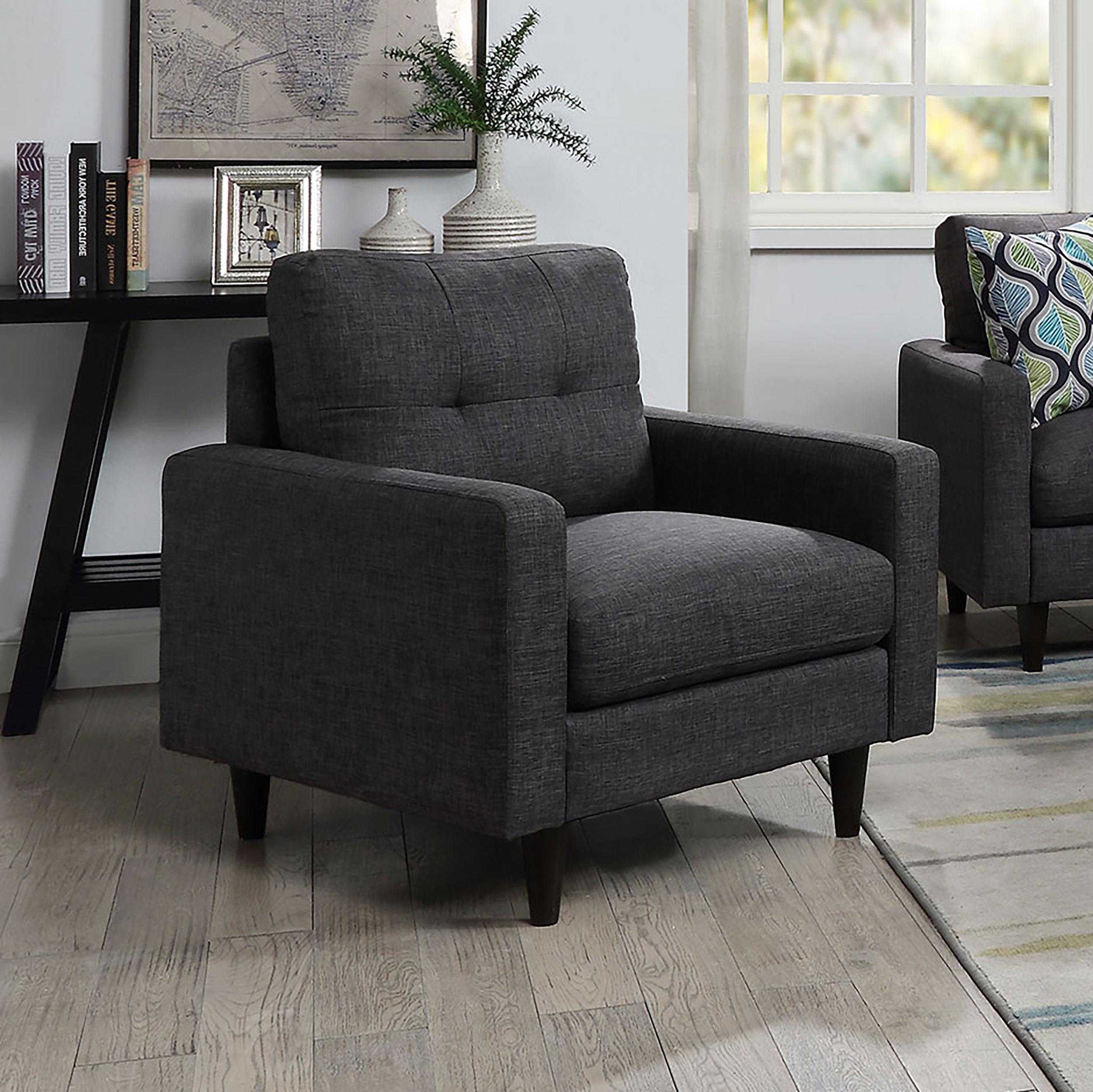 This armchair is an attractive accent for any living room or rec room. It features round tapered legs and armrests with clean, straight lines. Sumptuous seat cushions ensure afternoons and evenings of comfortable relaxation. Button-tufted seatback adds a touch of timeless panache. Wrapped in dark grey fabric that's suitable for any home decor.