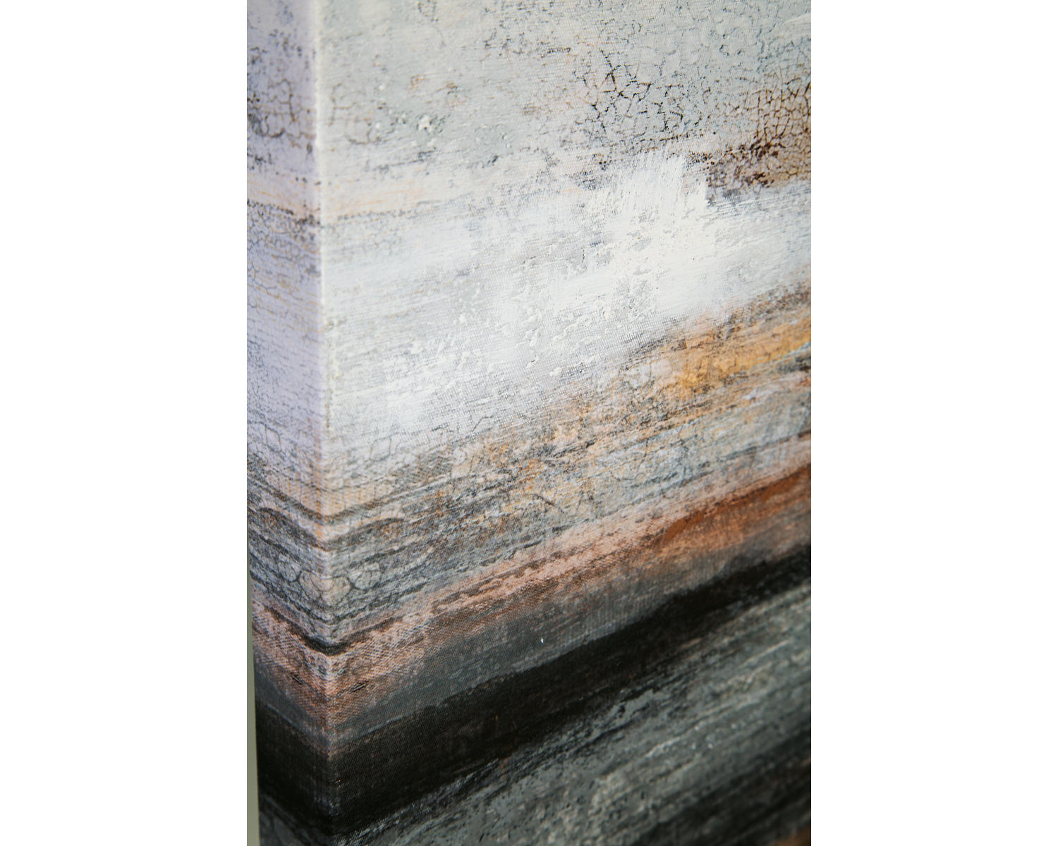 Abstract landscape design in shades of gray, blue, green, brown and gold. Gallery wrapped canvas. Hand painted embellishment. D-ring bracket for hanging. Hangs four ways. Due to the hand crafted nature of this product, some variations may occur.