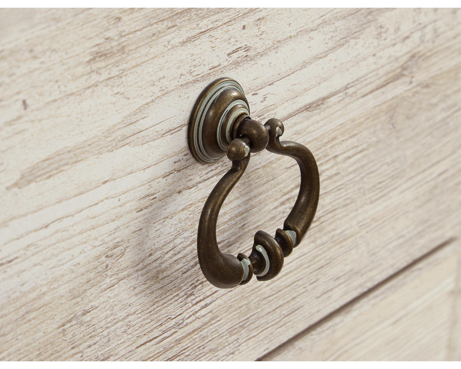 Two-toned finish in replicated white wash worn through paint and a replicated wood grained block pattern with an authentic touch. Cases feature ring pull hardware in an antique brass color, accented with white paint hang up. The EW0267-268 is compatible with the W100-101 LED fireplace insert. TV stand (268) and piers (124) include an adjustable/removable shelf. Assembly required.