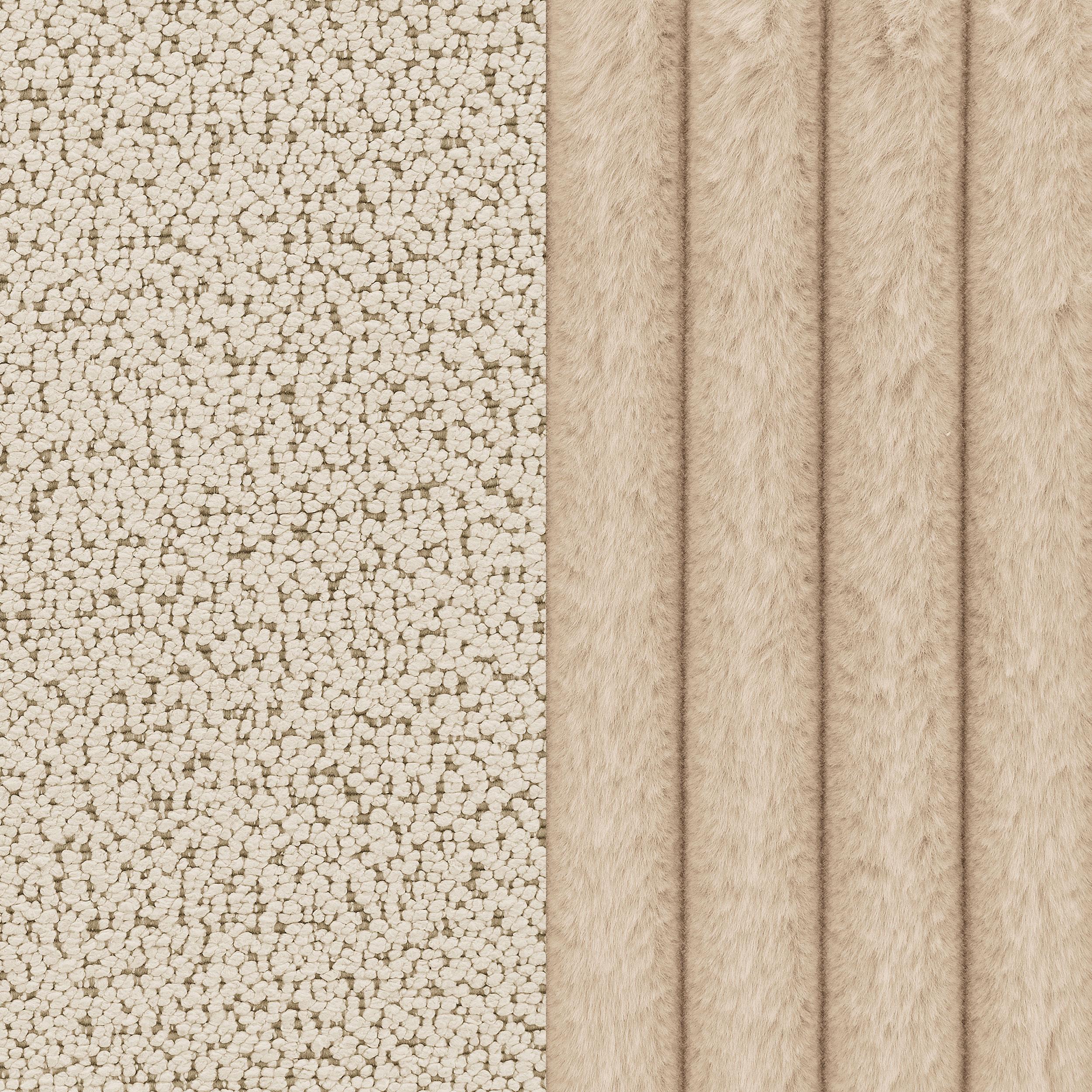 Introduce impeccable comfort and cozy vibes in your living room or den with a modern chair-and-a-half. This piece not only offers an extra-wide silhouette for the perfect curl-up spot but also features a fun bubble-like design that serves as the perfect interior focal point. The chair's wrap-around extra plush channeling with tufted accents on a waterfall bench seat adds an inviting warmth to your décor. It's further enhanced by wide corduroy accent pillows filled with premium down-like fill for lasting comfort. Upholstered in sand pebble boucle, this armchair offers a fresh, modern silhouette with piped armrests and channel tufting on the arms and back, creating a rich, inviting look that adds depth to your decor.