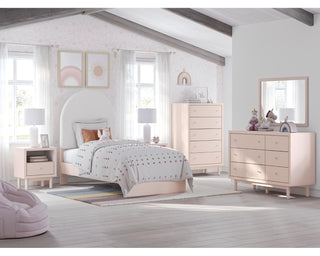 Subtle blush finish over replicated pecan wood grain. Inset drawers with champagne colored knobs. Side roller glides offer a smooth opening and closing of the drawer. Drawer interiors are lined with a replicated linen design for a clean, finished look. All cases feature cylindrical legs. Slim USB charger located on the back of the night stand tops. Twin (53) and full (87) upholstered headboards can attach to a bolt-on metal bed frame B100-21. Bed panels (52,84) require the use of twin/full platform rails (89) and roll slats (B100-11, B100-12). All side storage options (50,150) requires the use of the B100-11, B100-12 roll slats. All under bed storage units (50,150) accommodates to 10.5"W x 10.5"D x 11"H cube storage bins. Mirror (36) has the versatility to mount on the dresser or to the wall horizontally or vertically. Minor assembly required. Safety is a top priority, clothing storage units are designed to meet the most current standard for stability, ASTM F 2057 (ASTM International). Drawers extend out to accommodate maximum access to drawer interior while maintaining safety.